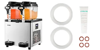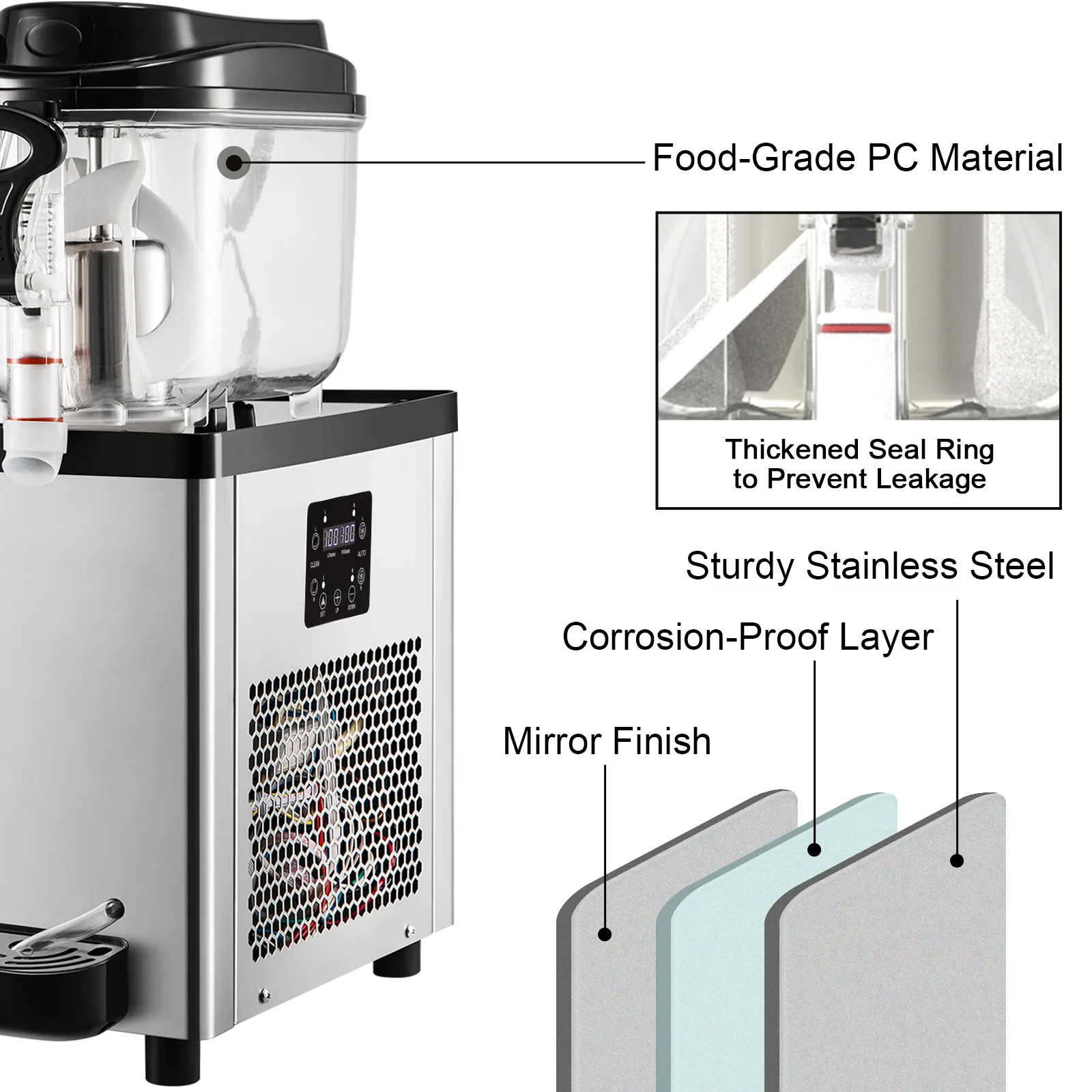 Nuestra máquina para hacer granizados está hecha de una construcción duradera con un cuerpo de acero inoxidable y un cilindro de policarbonato apto para uso alimentario. Hay un anillo de sellado engrosado en el orificio de descarga, no se preocupe por las fugas.