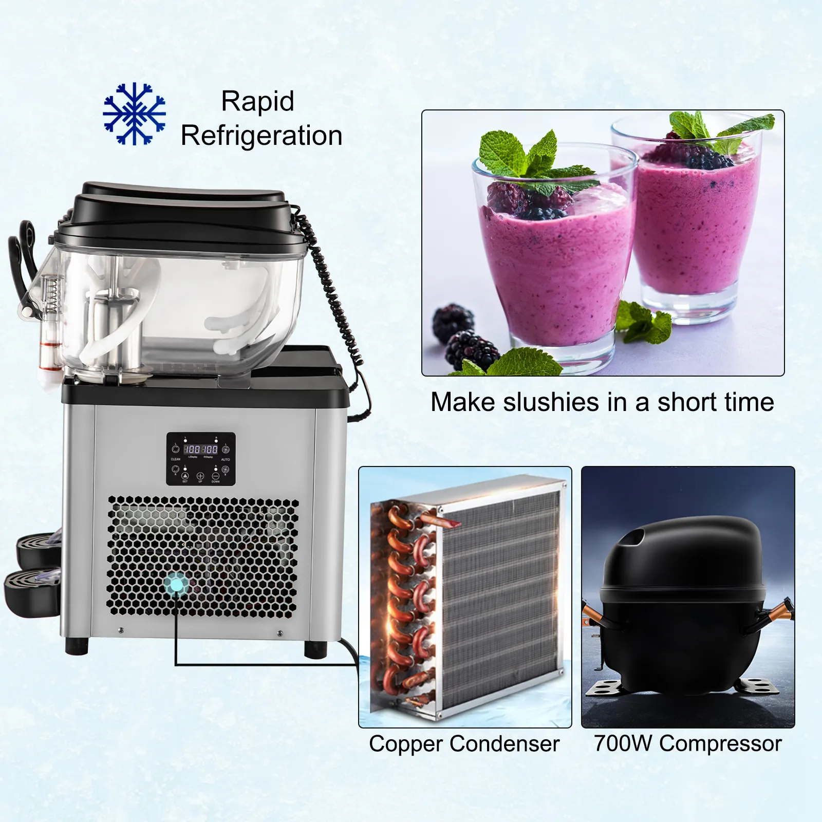 - ¿Está buscando una gran adición a su bar, restaurante o fiesta en la piscina? Esta máquina de granizado comercial es su opción ideal. Nuestra máquina granizadora de 2 tanques de 12 l/3,2 galones hace 50 tazas de deliciosas bebidas congeladas por ciclo, diseñada para entretener a más invitados. Un potente compresor de 700 W y un condensador de cobre prometen una refrigeración rápida y eficiente para la máquina de granizados. Puedes disfrutar de bebidas granizadas en cualquier momento y en cualquier lugar.