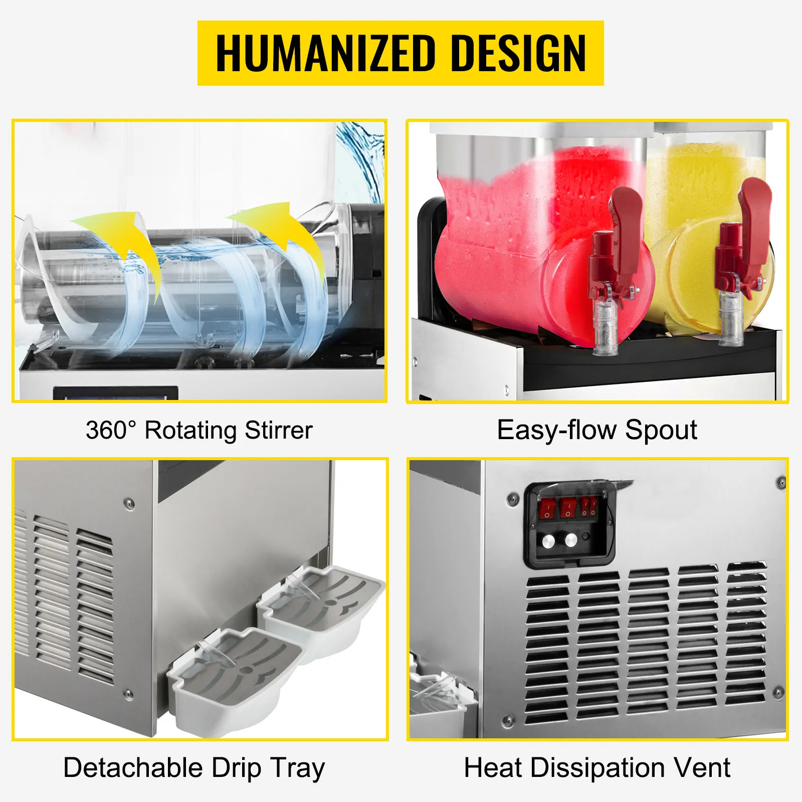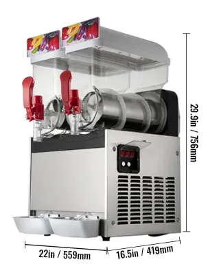 Además, el tanque de 15 L x 2 está diseñado para funcionar por separado, lo que significa que puede preparar y conservar dos delicias congeladas diferentes a diferentes temperaturas y texturas para satisfacer las diversas preferencias de los clientes. Lo más importante es que este dispositivo viene con un mecanismo agitador giratorio de 360 grados que garantiza una mezcla completa, una textura excelente y una consistencia uniforme. Es la solución ideal para lograr granizados suaves y sin cristales.