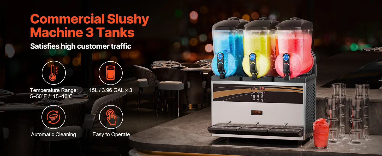 La máquina de bebidas congeladas de acero inoxidable VEVOR 1200W viene con tres tanques de 15 litros para preparar tres bebidas diferentes a la vez. Cada tanque funciona independientemente del otro sin arrastre en su desempeño.