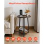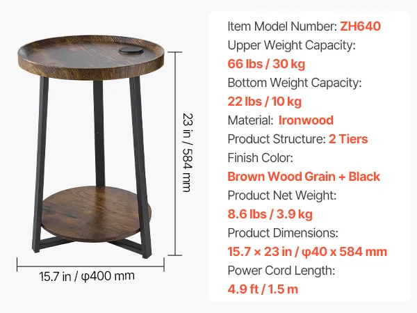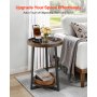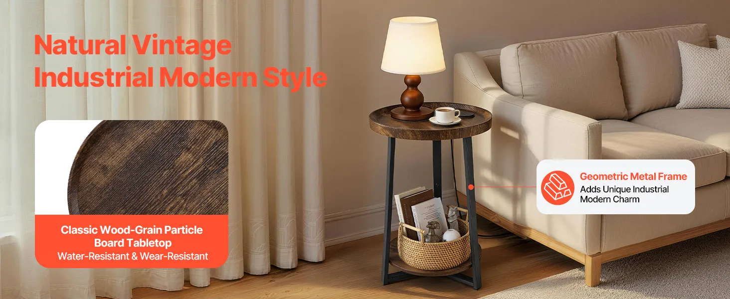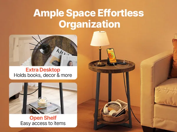 VEVOR Mesa auxiliar, mesa auxiliar redonda de 2 niveles con estantes abiertos, mesita de noche moderna con puerto de carga USB y CA, escritorio madera para sala de estar, dormitorio, oficina, marrón