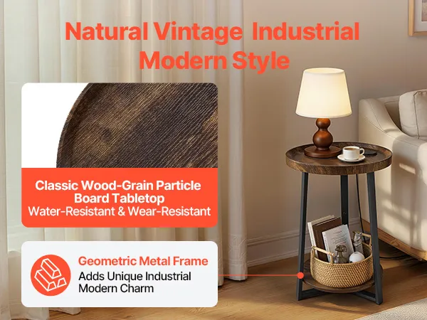 Con una clásica superficie de madera natural, resistente al agua y duradera, nuestra mesita de noche se mantiene como nueva con un mínimo mantenimiento. Su estructura metálica geométrica le da un toque industrial y se integra a la perfección con la decoración moderna, rústica o vintage.