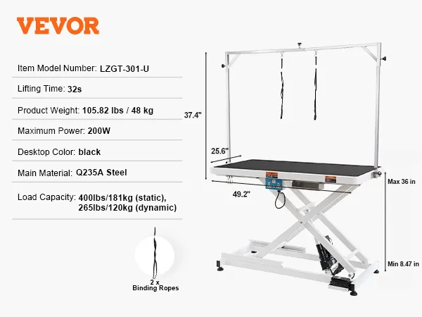 Mesa duradera para el cuidado de mascotas con una superficie de 49,2''x25,6'', que soporta hasta 400 libras de peso estático y 265 libras de peso dinámico. Fabricado en acero inoxidable resistente para mayor estabilidad y resistencia, con un diseño en forma de X para mayor estabilidad.