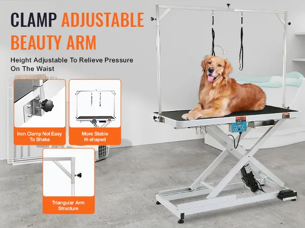 La mesa de aseo para mascotas cuenta con un diseño de brazo de aseo ajustable con abrazadera, lo que permite ajustar la altura general y reducir la necesidad de agacharse. El brazo ajustable mejora aún más la estabilidad.