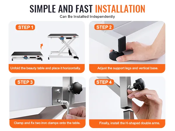 Fácil instalación: la instalación de esta mesa de aseo para mascotas es simple y conveniente y requiere solo cuatro pasos: Paso 1: despliegue la mesa de aseo y colóquela nivelada; Paso 2: ajuste las patas de soporte y la base vertical; Paso 3: sujete firmemente los dos accesorios de hierro a la mesa; Paso 4: finalmente, instale los brazos dobles en forma de H.