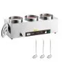 Calentador eléctrico de sopas VEVOR, con tres ollas redondas de acero inoxidable de 6.34 cuartos de galón (5.8 litros) con temperatura ajustable de 86 a 185 °F (30 a 85 °C), baño maría comercial de 1500 W con protección contra sobrecalentamiento y botón de reinicio. Ideal para restaurantes y bufés.
