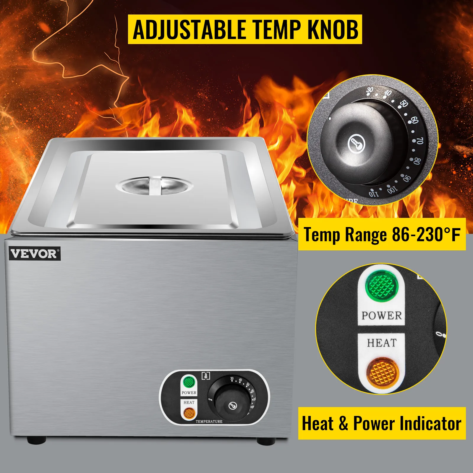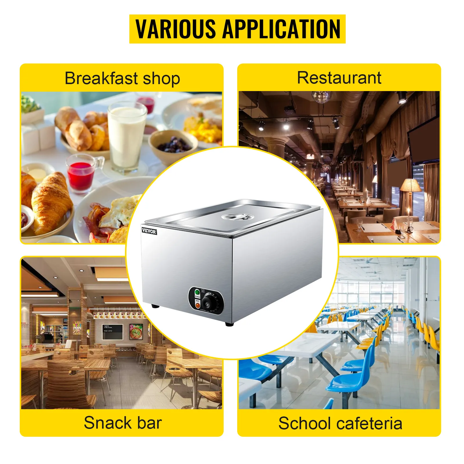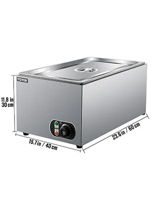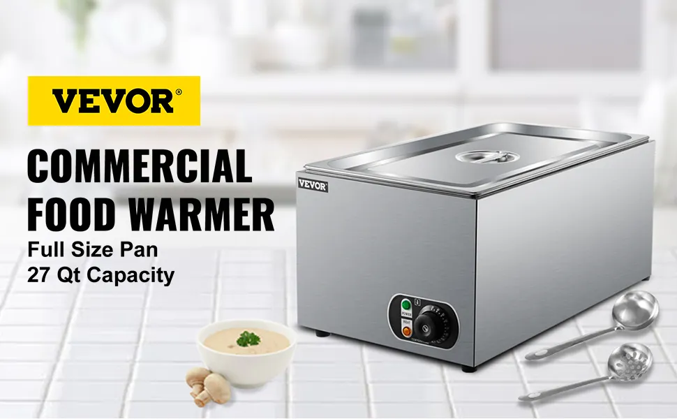 Este calentador de alimentos comercial tiene una bandeja de 27 Qt de capacidad y puede contener una cantidad más considerable de alimentos a la vez. Posee una perilla termostática en el rango de 86 ℉ a 230 ℉ (30 ℃ a 110 ℃ ), asegurando el sabor de la comida. Está equipado con un tubo de calentamiento eficiente para un calentamiento rápido y uniforme. Es un calentador de alimentos resistente y duradero que cuenta con patas antideslizantes, una tapa práctica y dos cucharones para ofrendas adicionales. Este calentador de mesa de vapor es la mejor opción para diversos usos domésticos y comerciales.