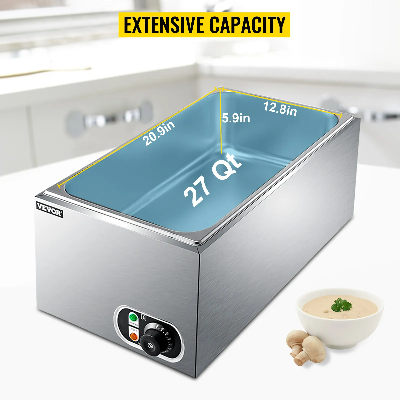 Nuestro calentador de alimentos comercial viene con una fuente de tamaño completo para una capacidad de 27 Qt. Es compatible con alimentos húmedos y secos, manteniendo su deliciosa comida caliente y lista para servir.