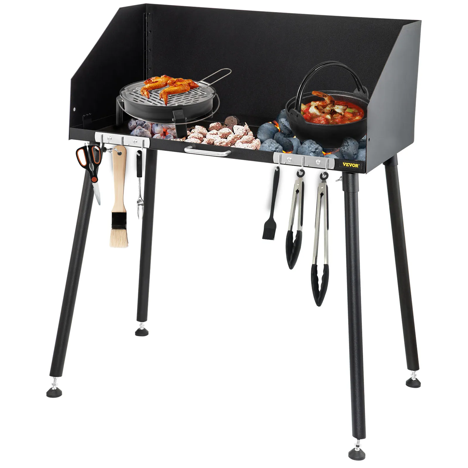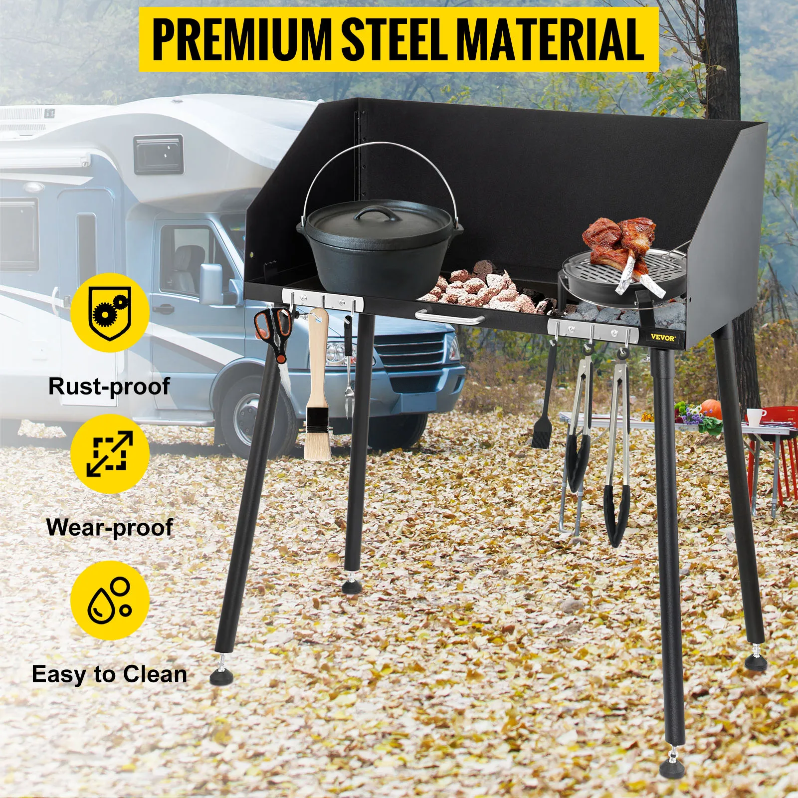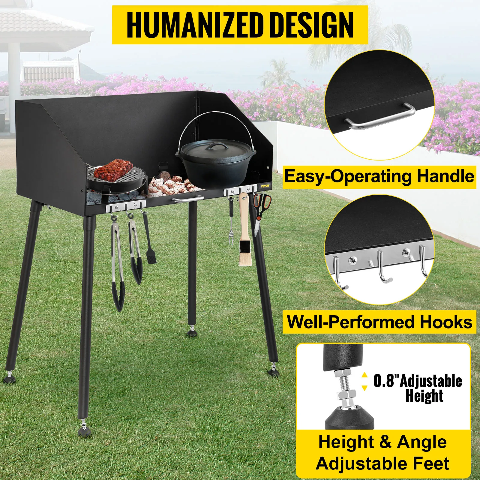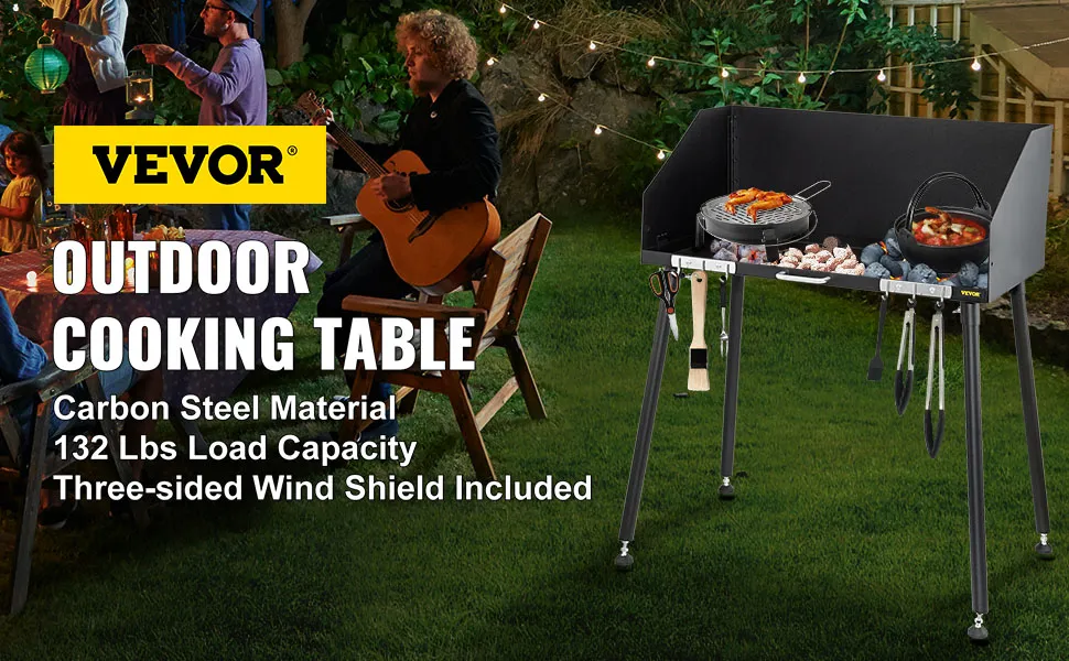 Nuestra mesa para acampar al aire libre adopta material de acero al carbono de alta calidad con un revestimiento de alta temperatura para un uso duradero. Tiene una capacidad de carga de 132 libras para sostener artículos más pesados. Además, está equipado con un paravientos de 3 lados, un asa y ganchos para colgar los utensilios de cocina y patas regulables para adaptarse a terrenos irregulares. Es fácil de instalar y perfecto para usar en lugares para cocinar al aire libre.