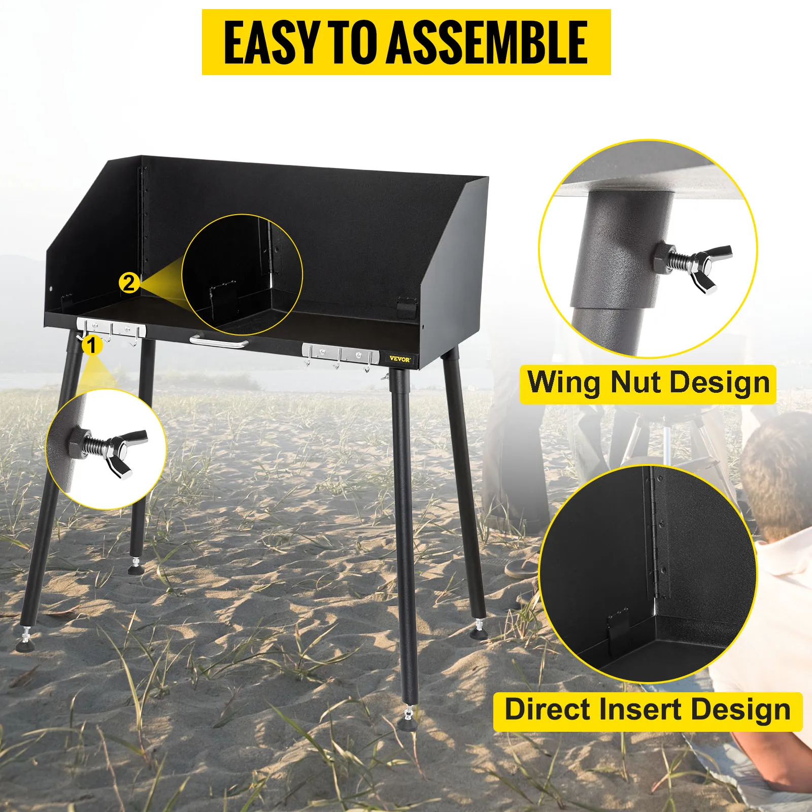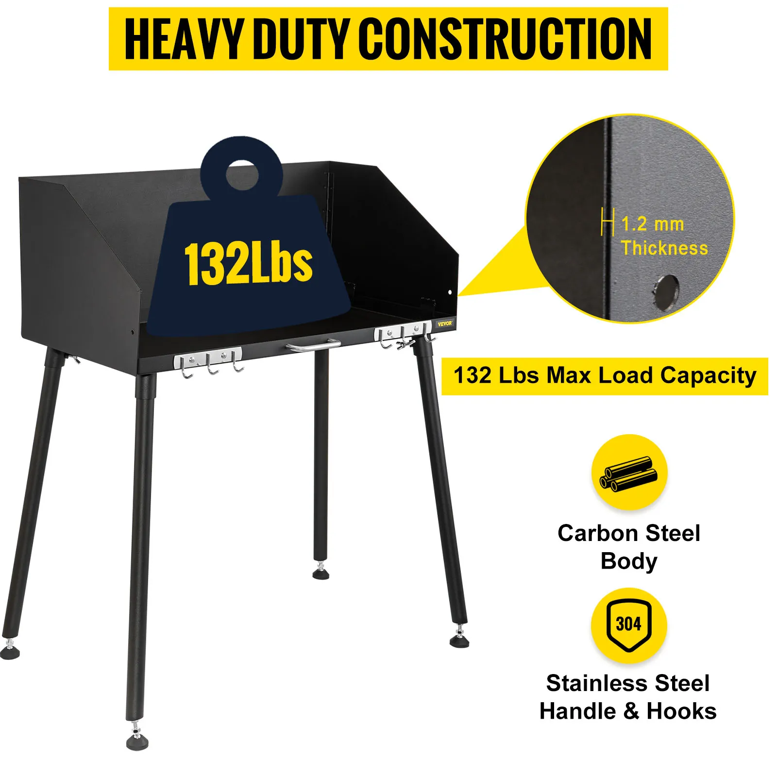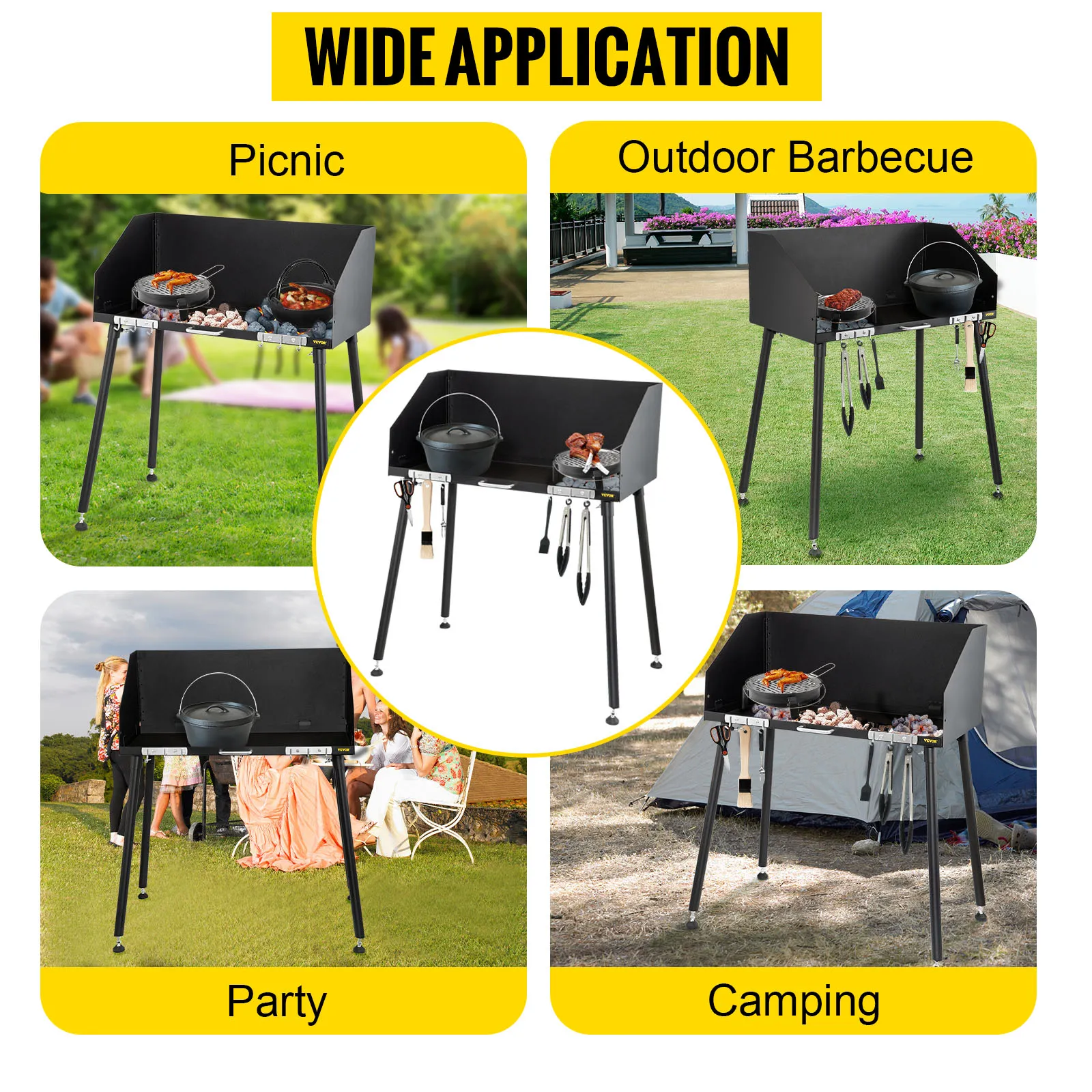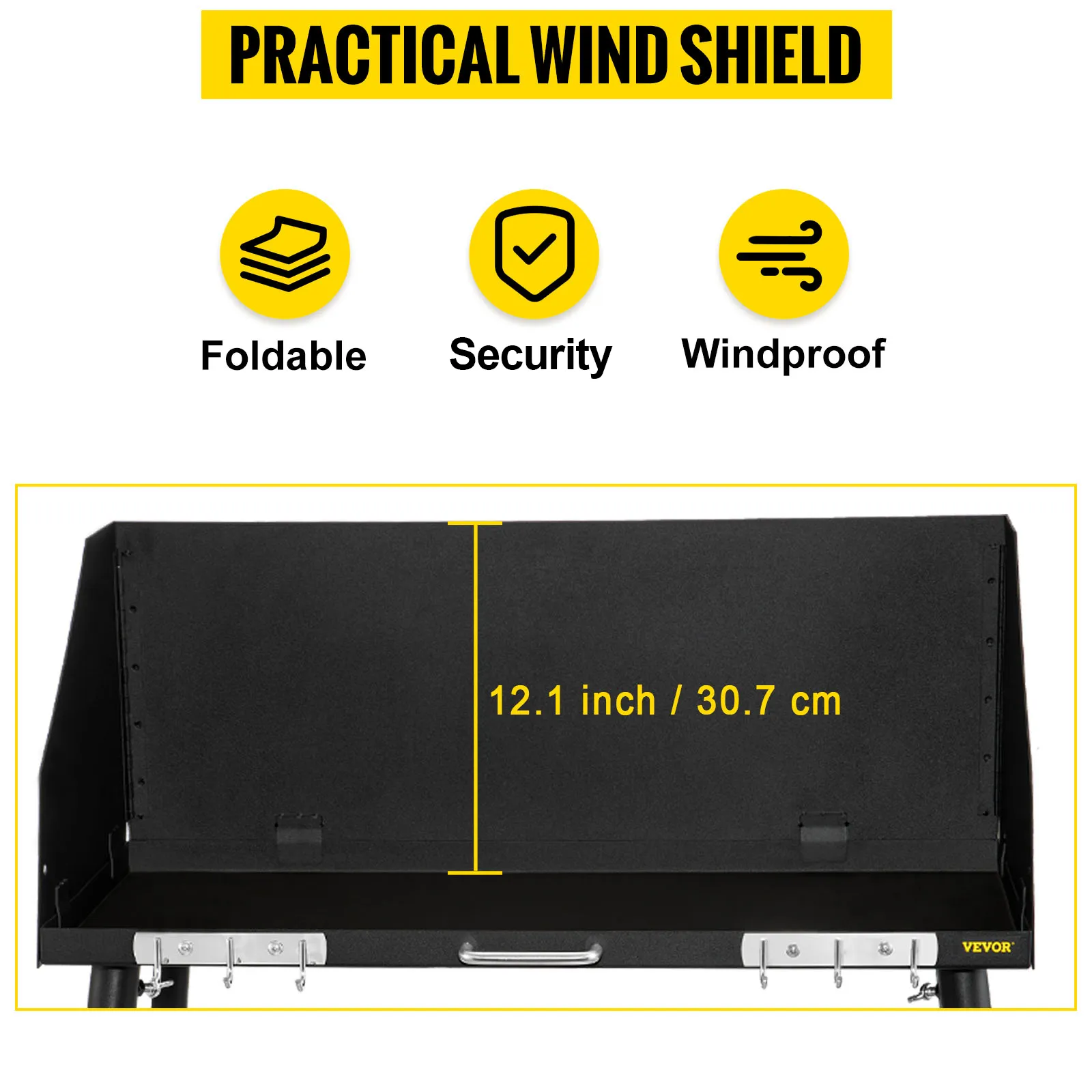 Nuestra mesa para acampar al aire libre adopta material de acero al carbono de alta calidad con un revestimiento de alta temperatura para un uso duradero. Tiene una capacidad de carga de 132 libras para sostener artículos más pesados. Además, está equipado con un paravientos de 3 lados, un asa y ganchos para colgar los utensilios de cocina y patas regulables para adaptarse a terrenos irregulares. Es fácil de instalar y perfecto para usar en lugares para cocinar al aire libre.