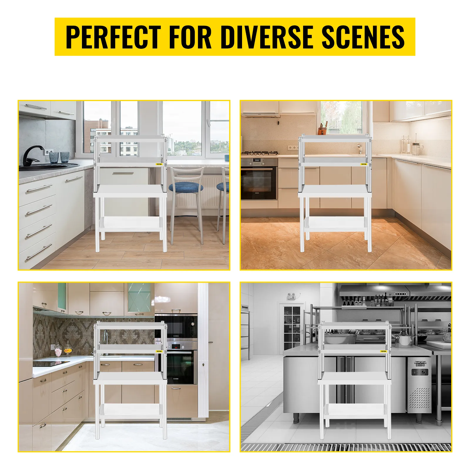 Además de utilizarse en casa como accesorio para una mesa de preparación o una mesa de diseño, esta repisa doble también es práctica para entornos comerciales o industriales. Es ideal para ser utilizado en fábricas, talleres, almacenes, restaurantes, cafeterías, panaderías, etc.