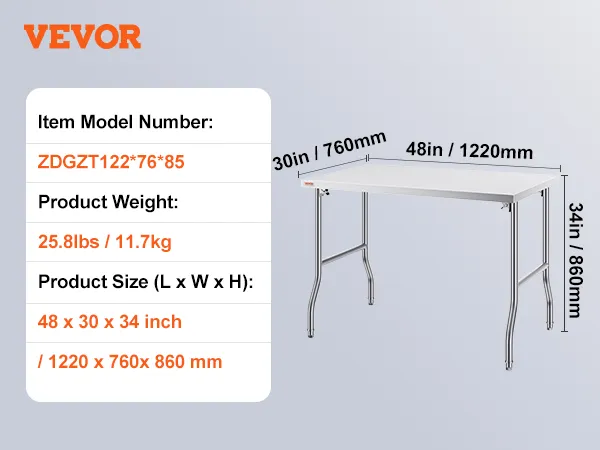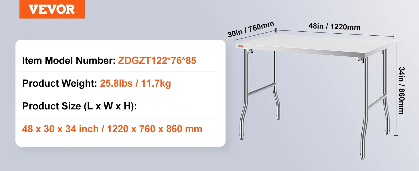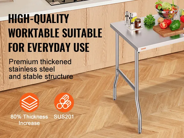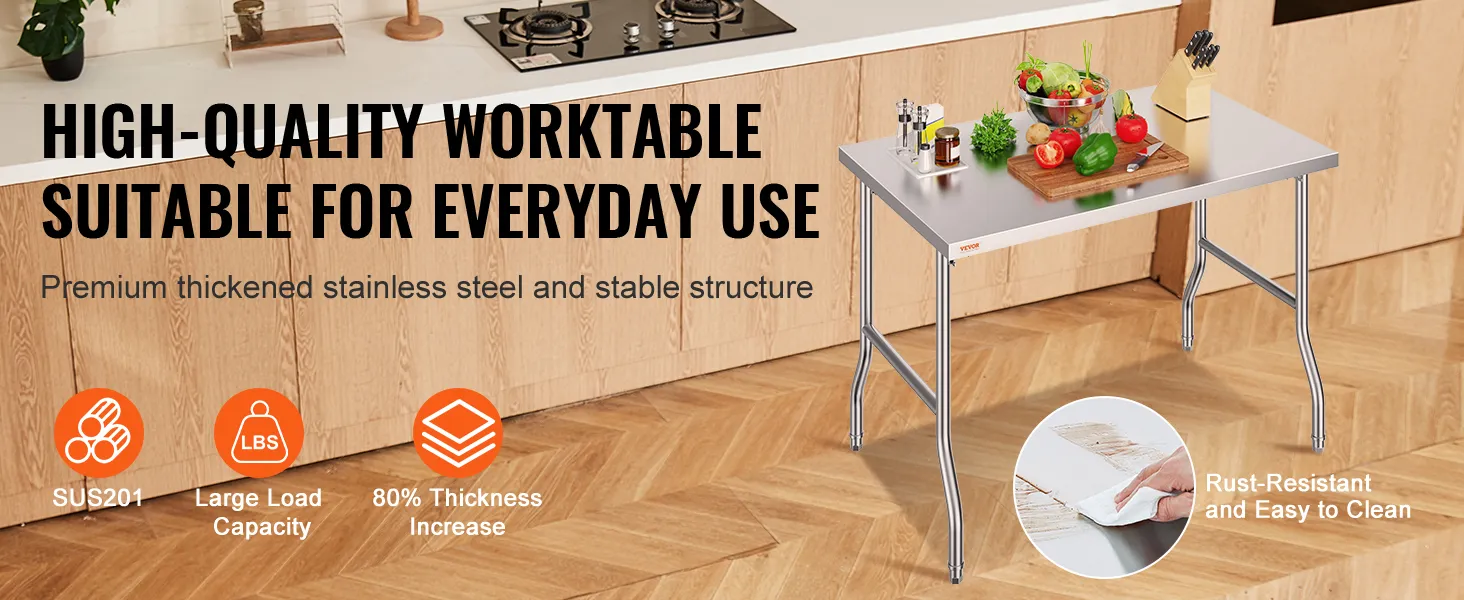 High-Quality Stainless Steel: This work table, measuring 48 x 30 x 33 inch, is made from SUS201 stainless steel for the tabletop, shelves, and legs. It offers superior rust resistance, a sleek appearance, and a smooth surface that is easy to clean with a simple wipe. It meets strict public health standards, ensuring long-lasting protection for your health.