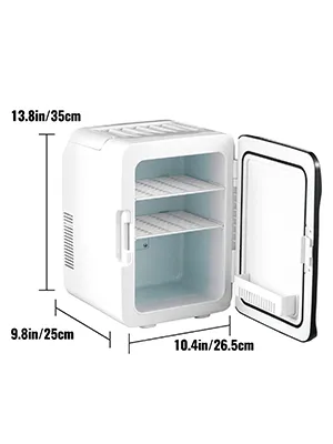 La nevera personal de 7,6 x 5,9 x 11,2 pulgadas (10 litros) puede almacenar fácilmente 12 latas de bebidas. Viene con dos estantes extraíbles, una cesta contenedor para que sea conveniente para almacenar artículos de diferentes tamaños de acuerdo a sus necesidades, tales como cosméticos, fruta, leche, almuerzo, etc.