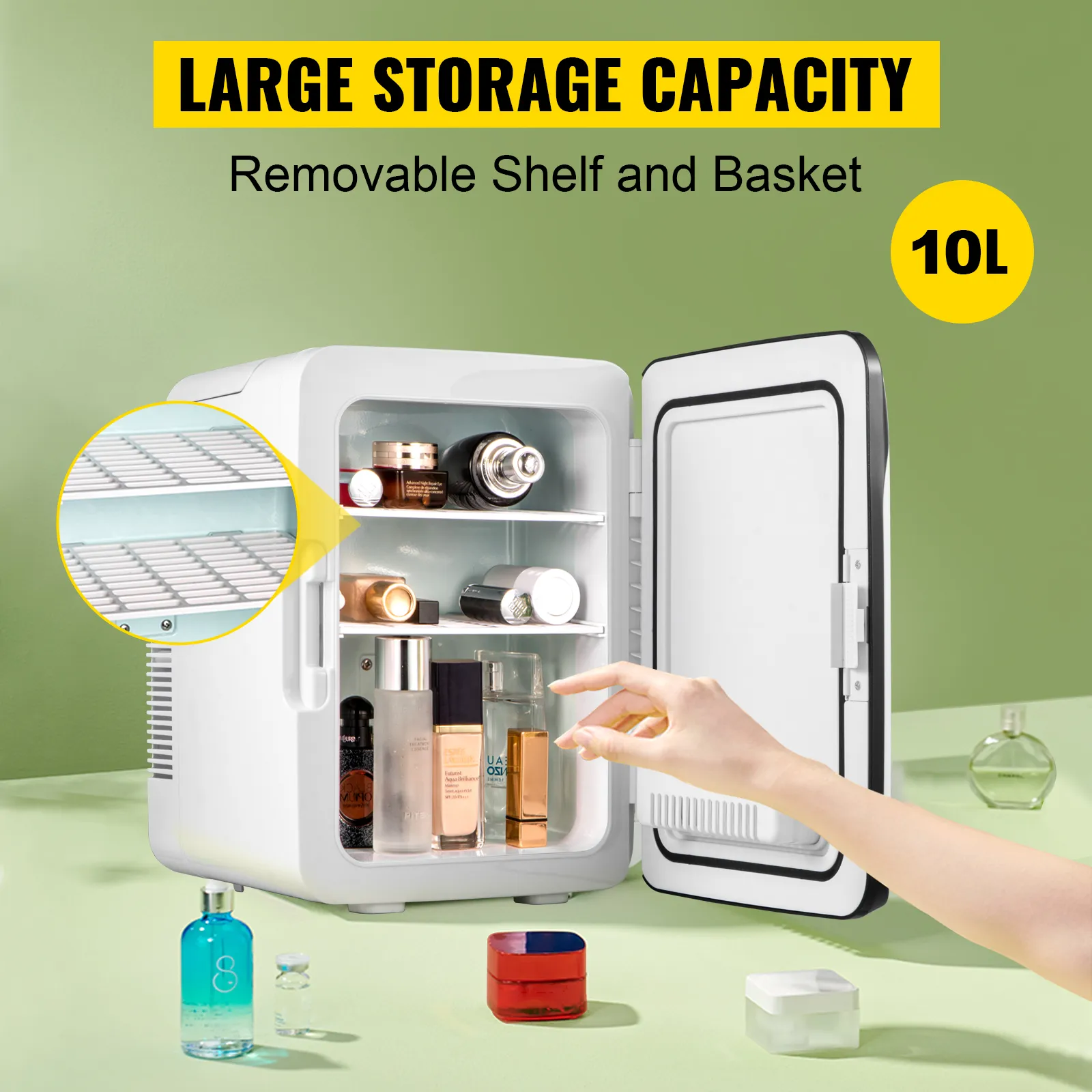 Le ofrecemos esta mini nevera súper versátil, con un aspecto elegante y un tamaño pequeño; es la favorita de la mayoría de la gente en casa, coche, oficina, bar, dormitorio, etc. Funciona bien como nevera y calentador, perfecto para almacenar alimentos, bebidas, cerveza, aperitivos, leche materna, etc. Especialmente, úselo para almacenar sus productos esenciales de belleza y cuidado de la piel y conviértalo en su nevera personalizada.