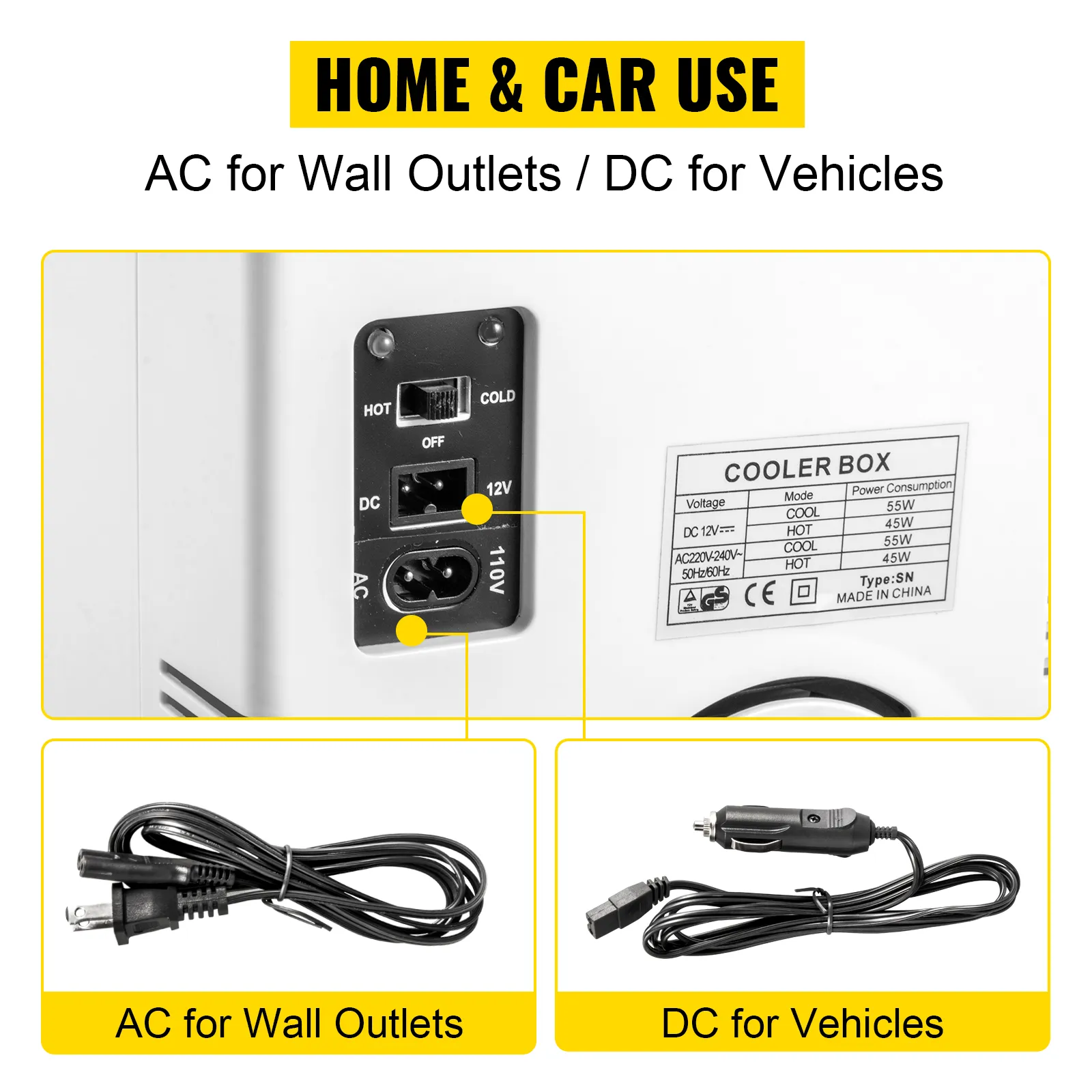 Incluimos dos enchufes (AC / DC), ambos aptos para las tomas de corriente estándar y los encendedores de 12V de los vehículos, para que pueda utilizarlos en casa y en el exterior, aumentando la versatilidad de nuestro mini refrigerador. Por favor, tenga en cuenta: Sólo haga funcionar el frío/calor cuando el motor esté encendido. De lo contrario, existe el riesgo de agotar la batería.