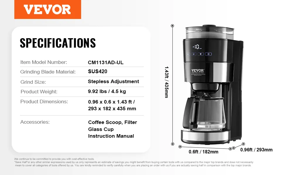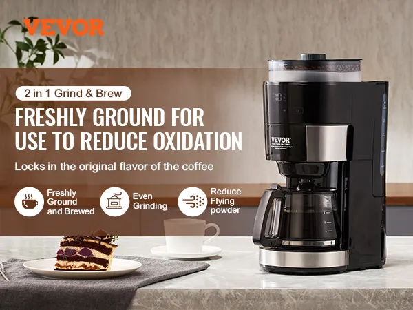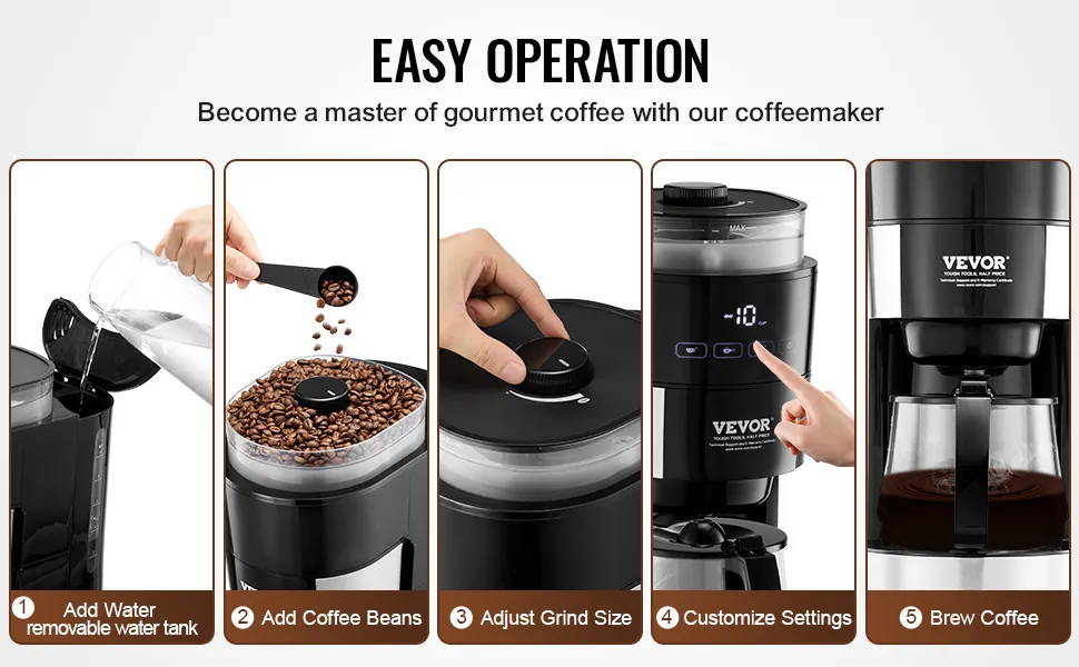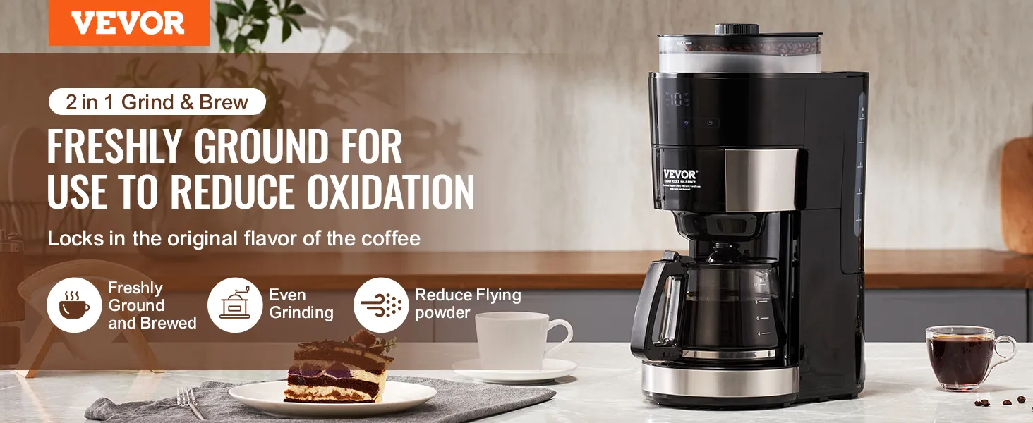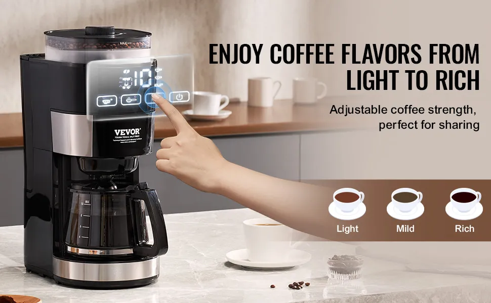 Cafetera VEVOR con molinillo, cafetera de 10 tazas, cafetera de goteo con molido ajustable, con 3 niveles de intensidad de café, ideal para casa, oficina y restaurante.