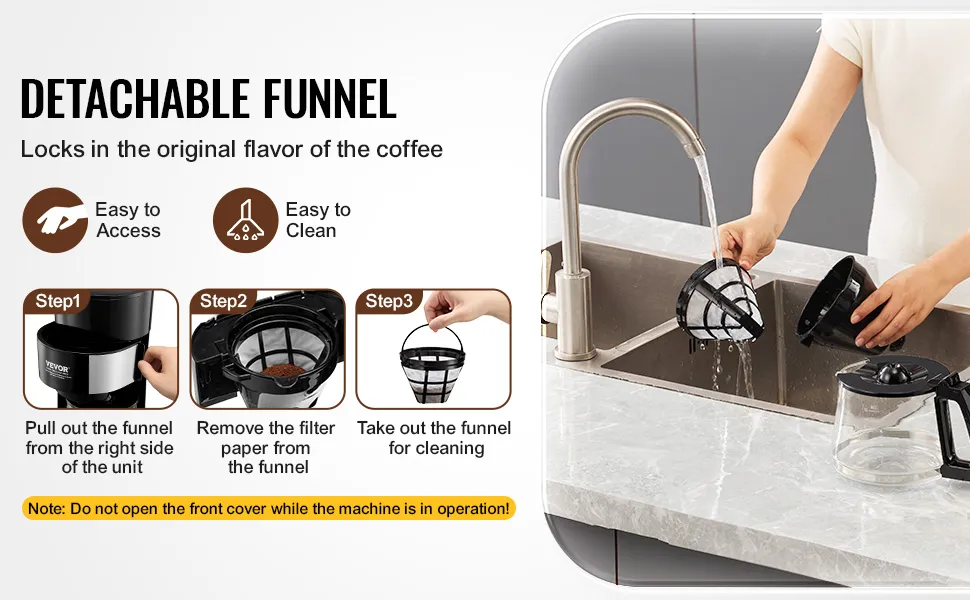 Compatible con papel de filtro, simplemente deseche el papel de filtro desechable junto con los posos de café para evitar la acumulación. El embudo se puede quitar fácilmente de la cafetera y enjuagar con agua, lo que elimina la necesidad de un proceso de limpieza engorroso.