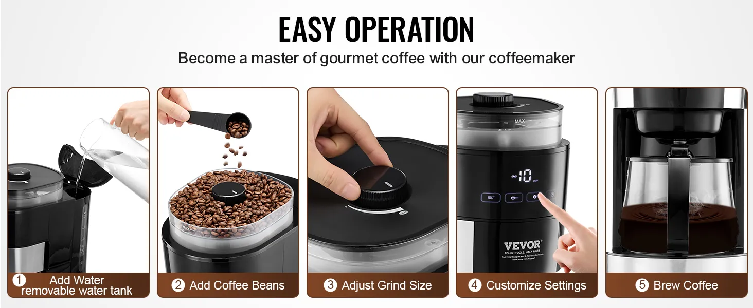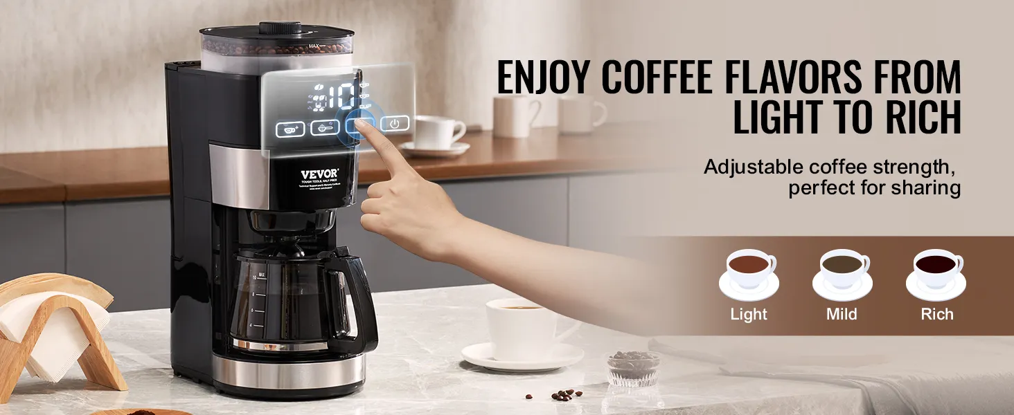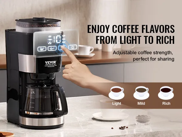 VEVOR Coffee Maker with Grinder, 10 Cup Coffee Machine, Grind and Brew Coffee Maker with 3 Brew Strength Control, Drip Coffee Maker with Adjustable Grinding Coarseness, for Home Office Restaurant