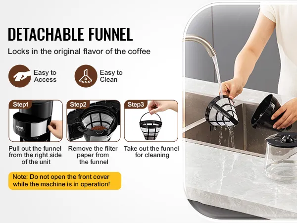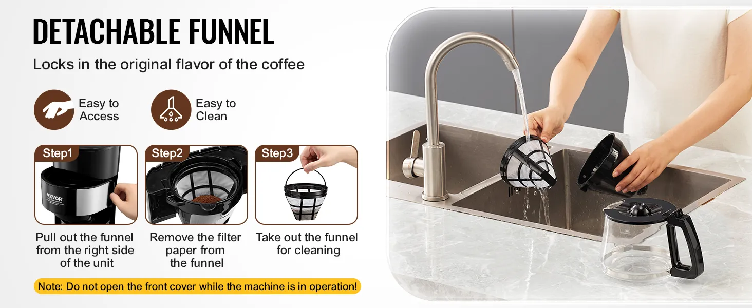 Compatible with filter paper, simply discard the disposable filter paper along with the coffee grounds to prevent accumulation. The funnel can be easily removed from the coffee machine and rinsed with water, eliminating the need for a cumbersome cleaning process.