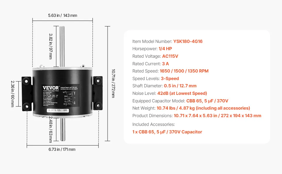 Accesorio conveniente: este motor de aire acondicionado para RV viene con un capacitor CBB65 de 5uf/370V, lo que elimina la necesidad de comprar una unidad compatible por separado, lo que garantiza un funcionamiento estable y eficiente del motor.
