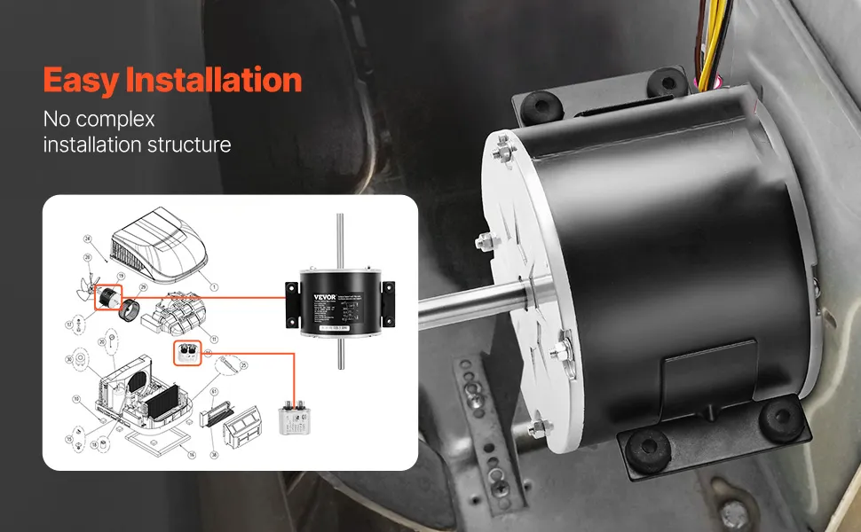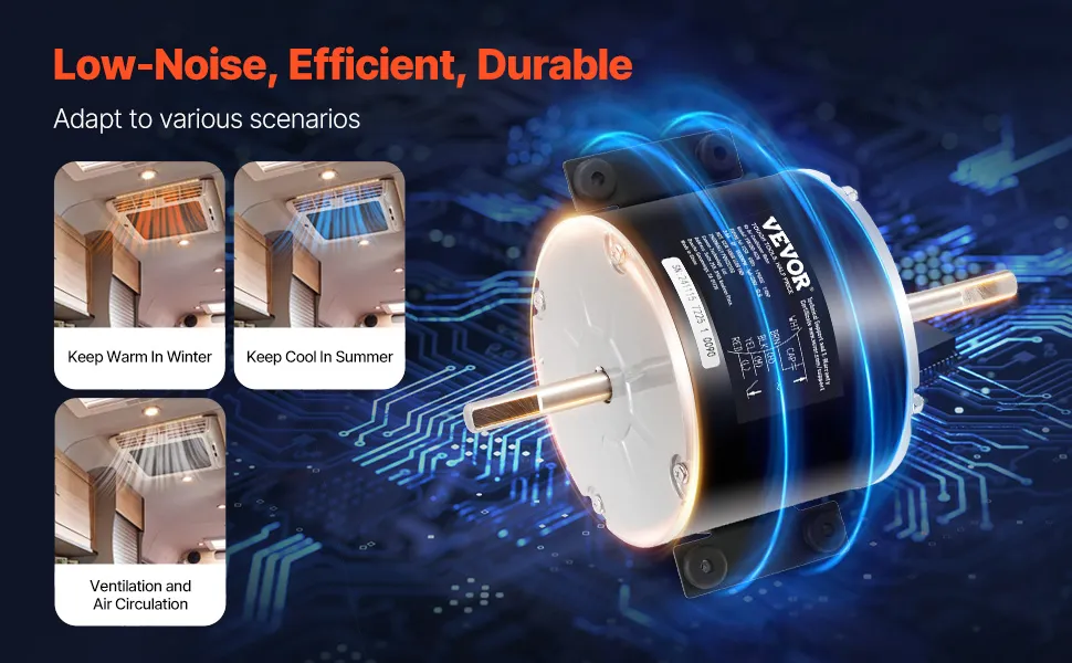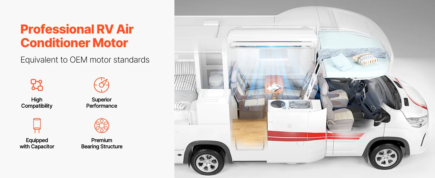 Equipado con cojinetes duraderos y de alta precisión, este motor de aire acondicionado para vehículos recreativos garantiza un funcionamiento suave al tiempo que ofrece una excelente resistencia al desgaste y una vida útil duradera, manteniendo su sistema de aire acondicionado para vehículos recreativos eficiente y confiable.