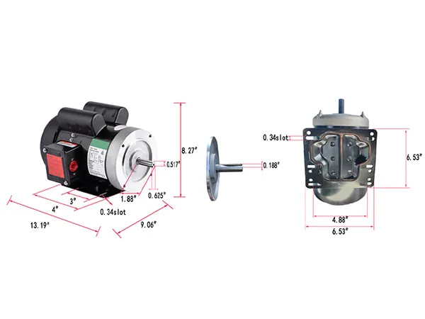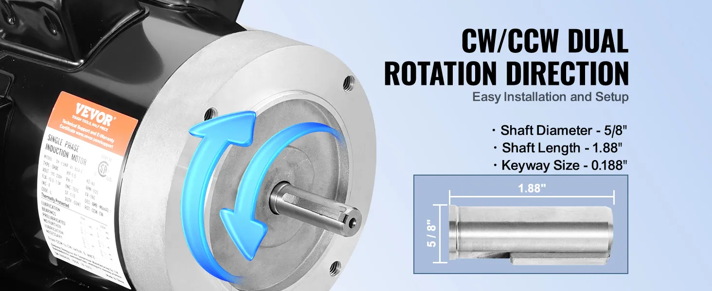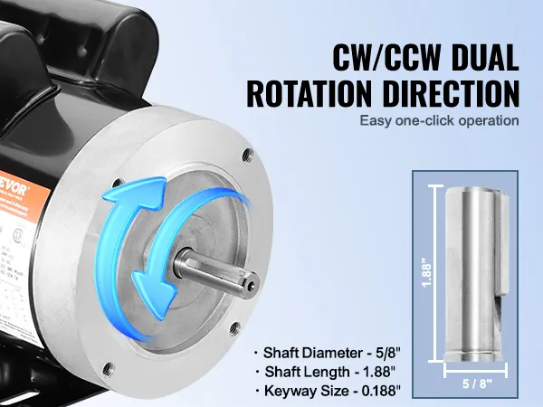 Con doble sentido de rotación (CW/CCW), este motor de compresor de aire es fácil de instalar y usar. Con un diámetro de eje de 5/8", una longitud de eje de 1,88" y una chaveta de 0,188", se conecta fácilmente a diversos equipos, ofreciendo gran versatilidad para diferentes aplicaciones.