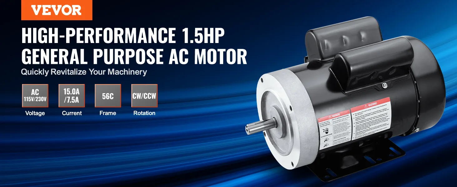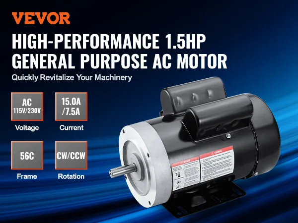 Impulse el rendimiento de su equipo con el motor eléctrico VEVOR de 1.5 HP. Funciona a 115 V/230 V con una corriente de 15.0/7.5 A, ofrece una alta velocidad de 1725 RPM, un chasis de 56C, un eje de 4.7 cm (1.88 pulgadas), un eje con chaveta de 16.9 mm (5/8 pulgadas) y doble sentido de rotación (CW/CCW).