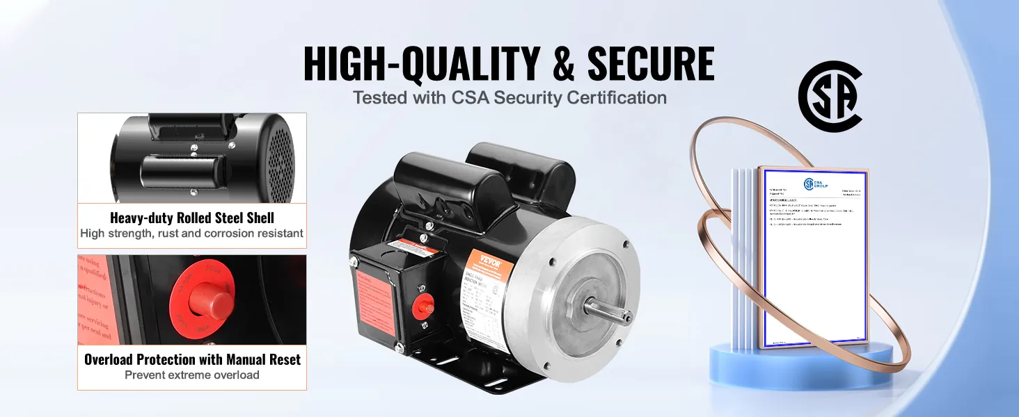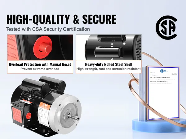 Duradero y seguro: Probado según las normas CSA, este motor de compresor de aire cuenta con una carcasa de acero laminado de alta resistencia para una mayor durabilidad. También incluye protección contra sobrecargas con reinicio manual, lo que garantiza una mayor vida útil y un rendimiento confiable.