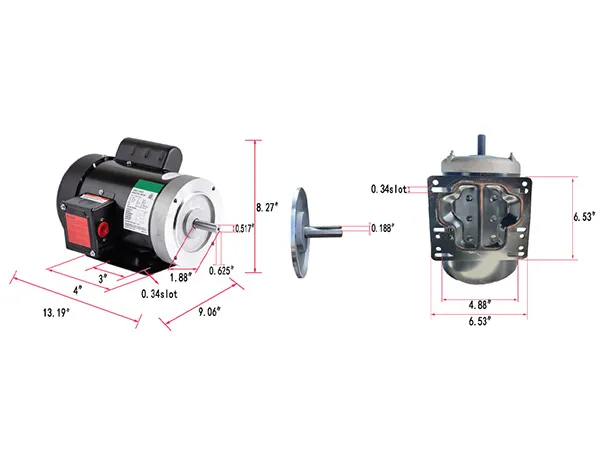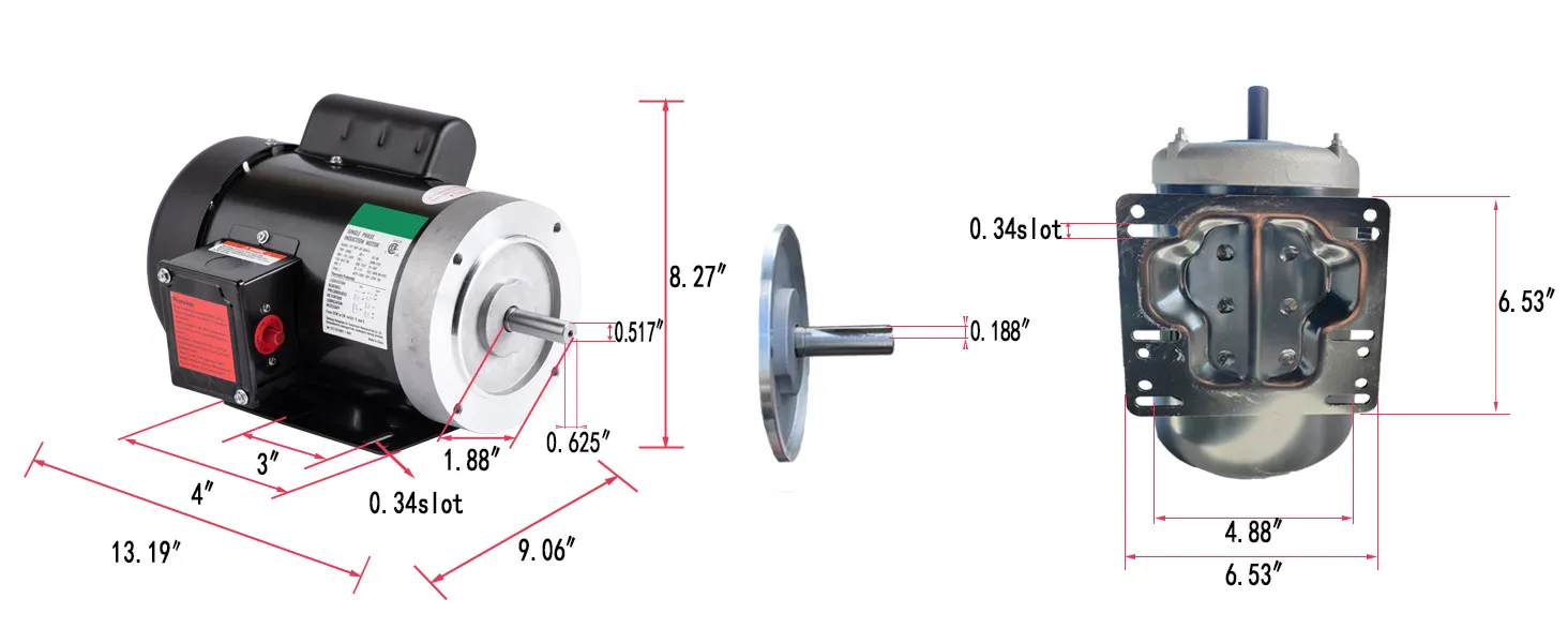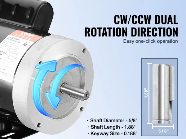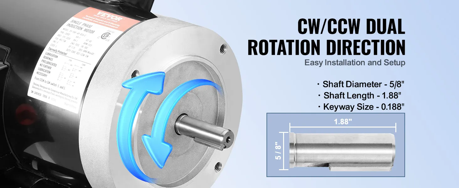 Con doble sentido de rotación (CW/CCW), este motor para compresor de aire es fácil de instalar y usar. Con un diámetro de eje de 5/8", una longitud de eje de 1,88" y una chaveta de 0,188", se conecta fácilmente a diversos equipos, ofreciendo gran versatilidad para diferentes aplicaciones.