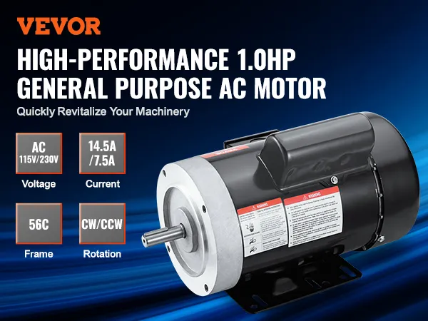 Aumente el rendimiento de su equipo con el motor eléctrico VEVOR de 1 HP. Funciona a 115 V/230 V con una corriente de 14,5/7,5 A, ofrece una alta velocidad de 1725 RPM, un bastidor de 56C, un eje de 4,7 cm (1,88 pulgadas), un eje con chaveta de 1,6 cm (5/8 pulgadas) y doble sentido de rotación (CW/CCW).