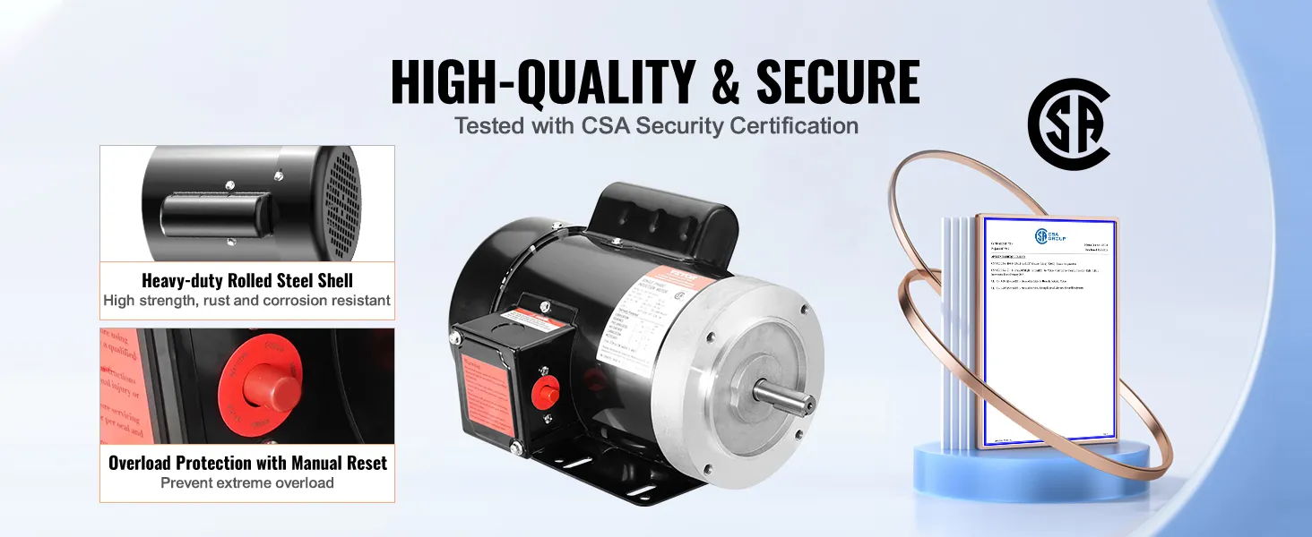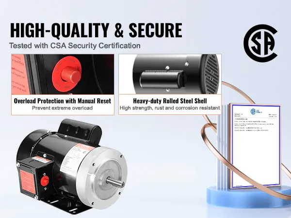 Duradero y seguro: Probado según las normas CSA, este motor de compresor de aire cuenta con una carcasa de acero laminado de alta resistencia para una mayor durabilidad. También incluye protección contra sobrecargas con reinicio manual, lo que garantiza una mayor vida útil y un rendimiento confiable.