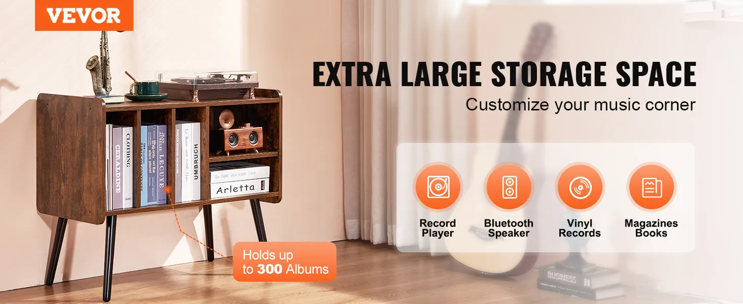 Elegante presentación: la amplia superficie de la mesa, combinada con un estante de almacenamiento abierto, maximiza el uso del espacio. Organice fácilmente hasta 220 álbumes, con paneles laterales que evitan que los artículos se caigan de la mesa, manteniendo su colección de música perfectamente organizada.