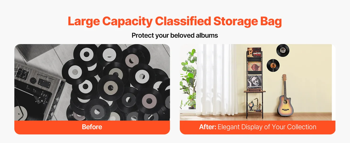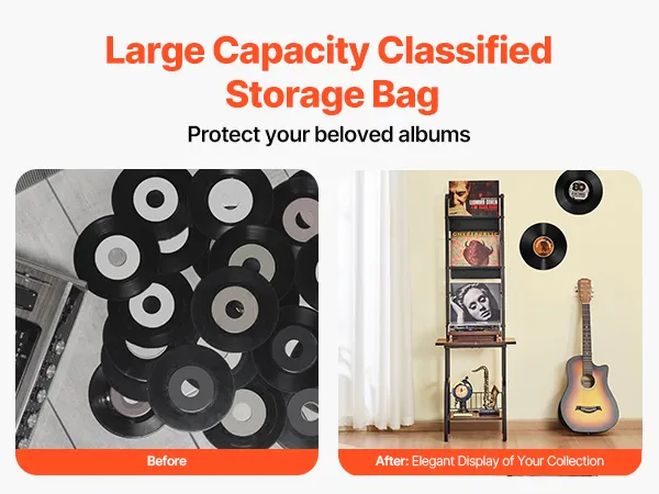 Smart Display & Organization: This vinyl record player stand features independent Oxford fabric bags, allowing for flexible categorization of your vinyl records. It prevents them from tipping over or getting damaged, keeping your music treasures safe and organized.