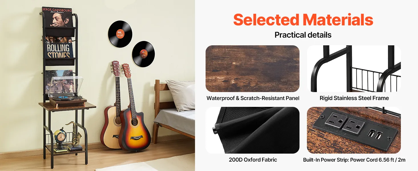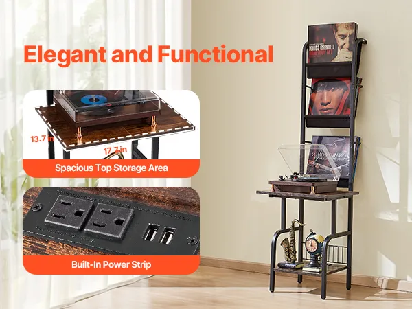 Built-in Charging and Lighting: Equipped with a high-quality power strip for easy connection to various devices, and a unique light feature that syncs with your music, this vinyl player stand enhances your experience. The vintage brown partitions, combined with a durable stainless steel frame, ensure durability and style.