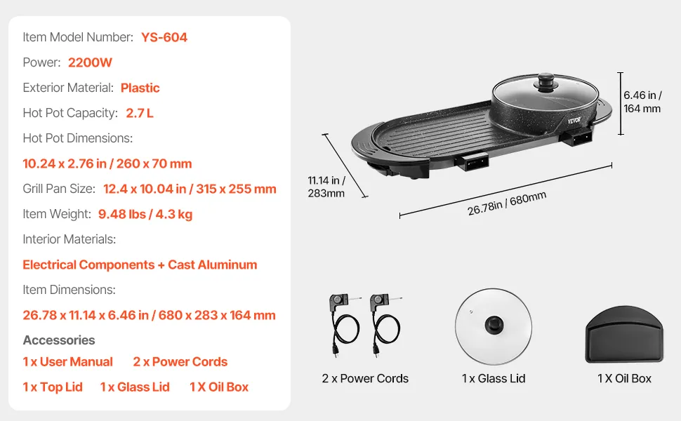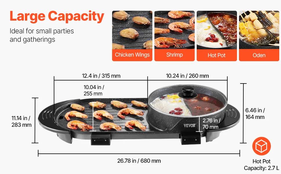 Nuestro combo de parrilla y olla caliente de 2,7 L cuenta con una olla caliente de 260 x 70 mm (10,24 x 2,76 pulgadas) y una sartén para parrilla de 315 x 255 mm (12,4 x 10,04 pulgadas), lo que la hace lo suficientemente grande para una comida completa con familiares y amigos.