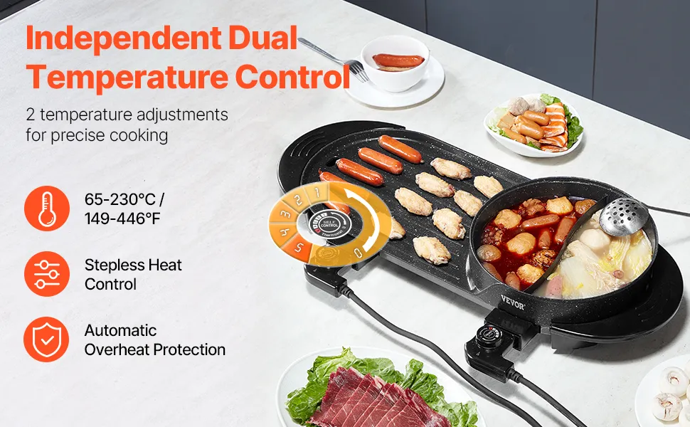 Nuestra olla eléctrica con grill ofrece dos zonas de control para ajustes de calor independientes y precisos. Controla fácilmente el fuego bajo y alto, garantizando una cocción sin interferencias y brindándole control total para obtener resultados deliciosos.