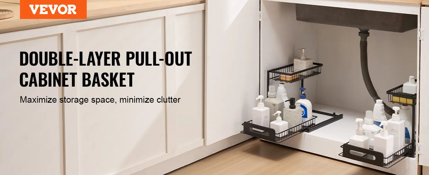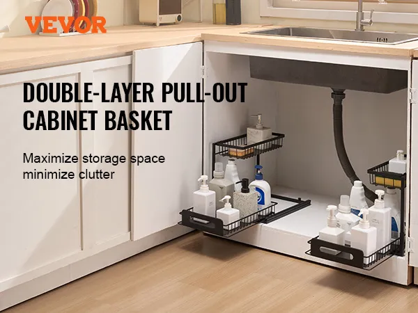 Organizador de gabinete extraíble de 2 niveles VEVOR (27,5 cm de ancho x 36,5 cm de profundidad), organizador y almacenamiento debajo del fregadero, organizador de gabinete con cajón extraíble, estante de canasta de alambre, 65,7 cm de ancho x 39,4 cm de profundidad x 33 cm de alto, tamaño de instalación para gabinete (paquete de 2)