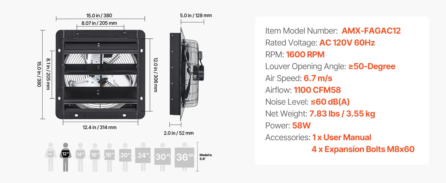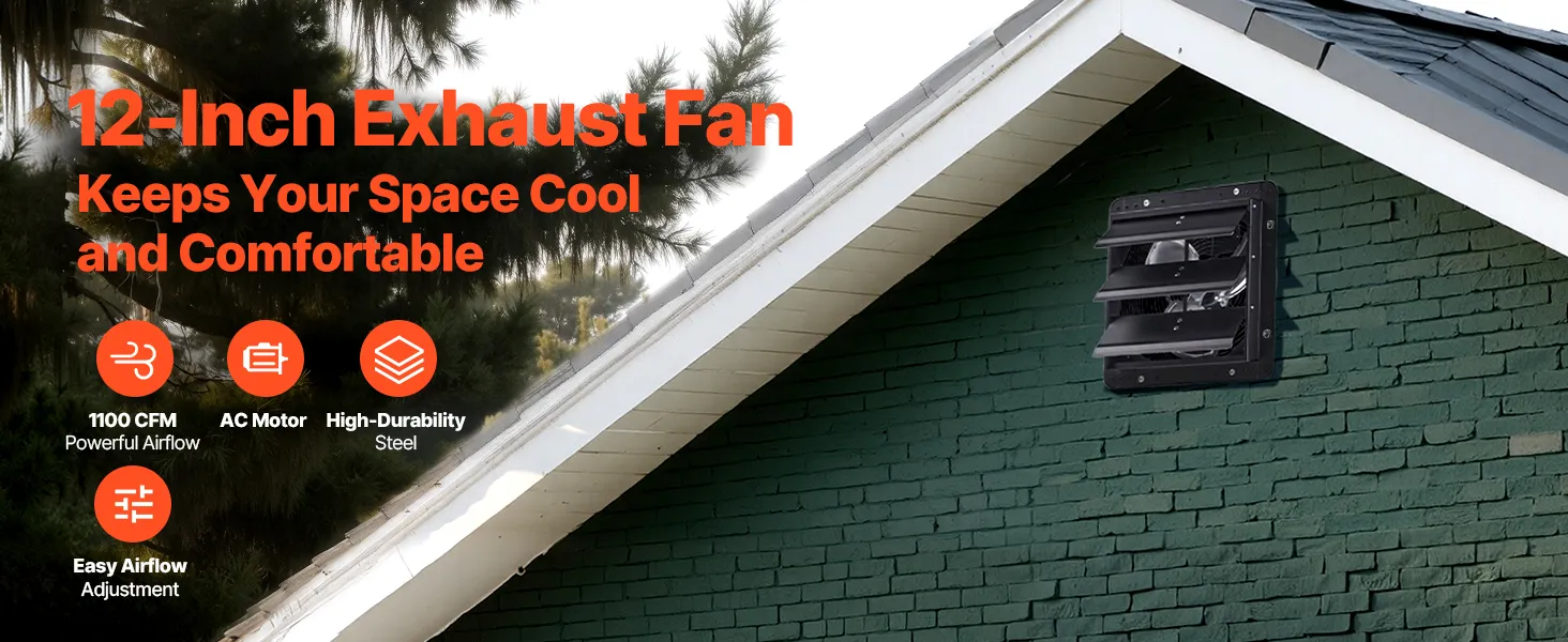 VEVOR Ventilador de escape de 12 pulgadas con persianas, para ático, de pared, con controlador de velocidad variable, 1100 CFM, motor de CA, acero resistente, silencioso, para cobertizos, garajes e invernaderos, color negro