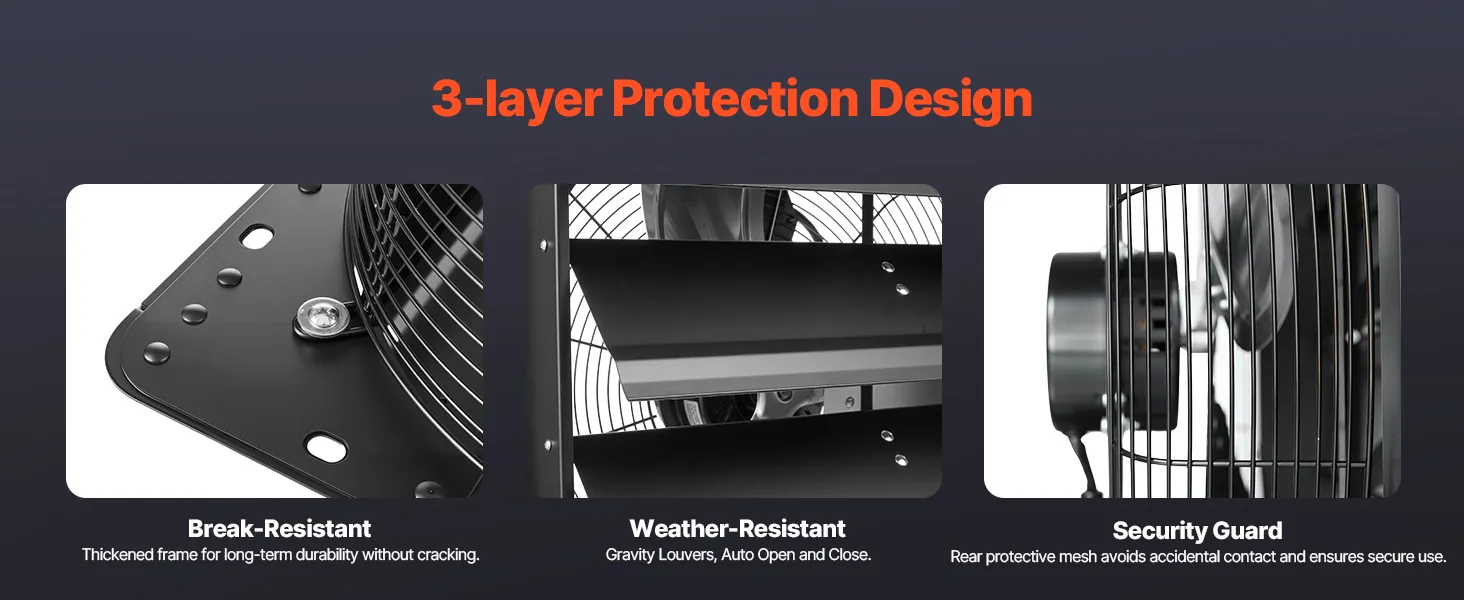 El motor de alta calidad y el acero de alta dureza ofrecen un rendimiento estable y duradero. Su potente flujo de aire expulsa rápidamente el calor y la humedad del interior para un aire más fresco.