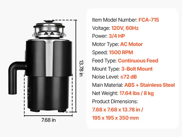 Triturador de residuos de alimentos VEVOR, motor de CA de 3/4 HP y 1500 RPM, triturador de residuos de fregadero de cocina de alimentación continua, sistema de trituración de residuos de alimentos con montaje de 3 pernos, protector contra salpicaduras y cable de alimentación para cocinas.