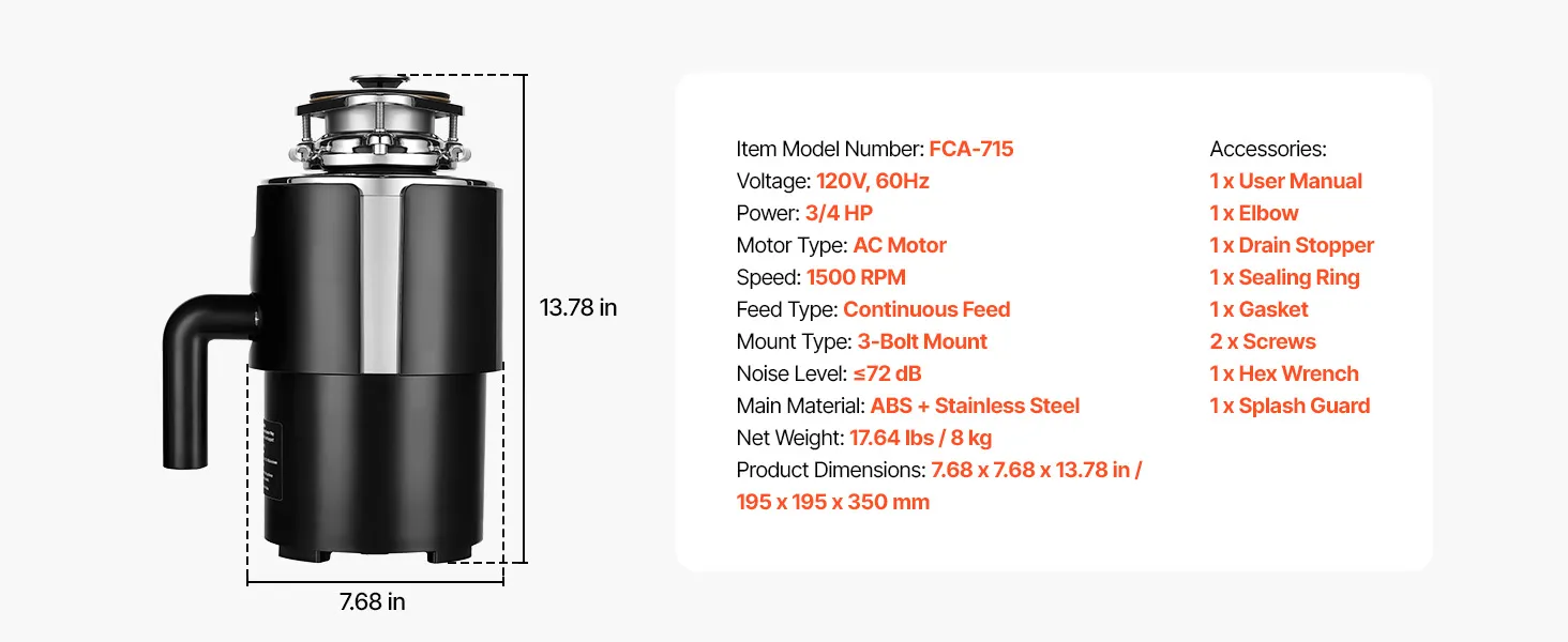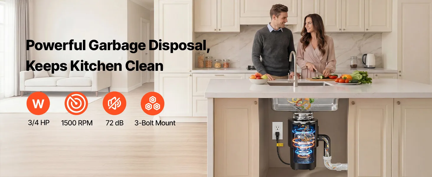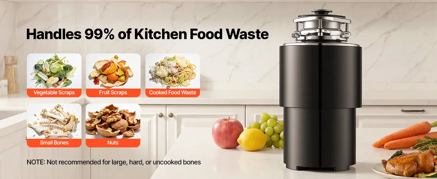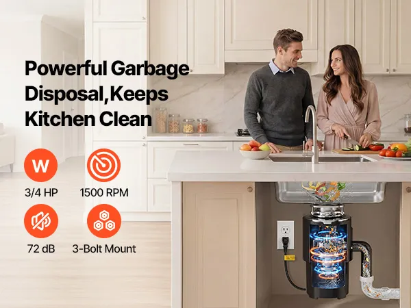 Trituración potente, eliminación más rápida: Impulsado por un motor de inducción de CA de 3/4 HP a 1500 RPM, este triturador de residuos de alimentos VEVOR ofrece un potente rendimiento de trituración. Descompone rápidamente los restos de comida, reduce las obstrucciones de los desagües y mantiene la cocina limpia.