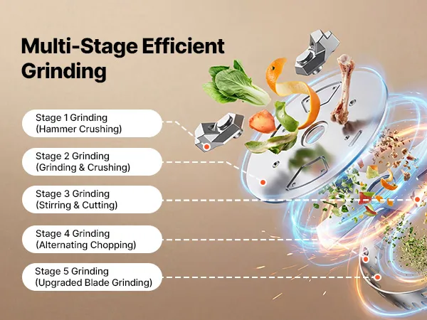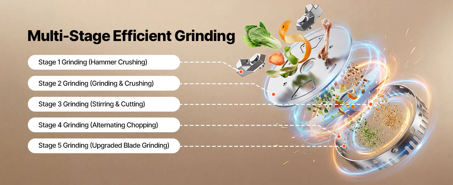 El sistema de molienda de múltiples etapas descompone eficientemente los desechos de alimentos en partículas más finas, lo que ayuda a reducir las obstrucciones y al mismo tiempo brinda un rendimiento suave y un funcionamiento diario confiable.