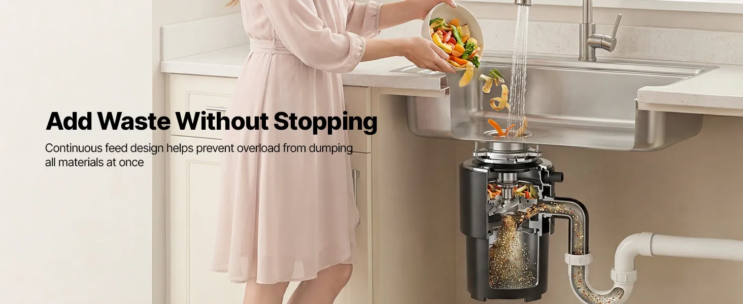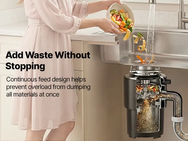 Alimentación continua: Este triturador de residuos de comida ofrece alimentación continua con trituración multietapa para procesar una amplia gama de restos de cocina. Tritura eficazmente cáscaras de verduras, espinas de pescado, huesos de fruta y más, minimizando las obstrucciones del fregadero.