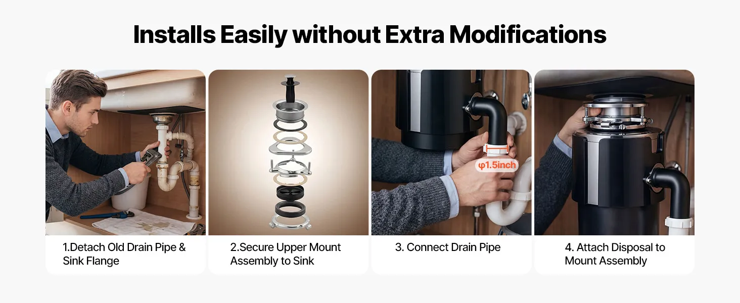 Diseñado con un sistema de montaje de 3 pernos, este triturador de basura se instala rápidamente. Ponga en funcionamiento su triturador de basura en minutos y comience a procesar los residuos de cocina eficientemente.