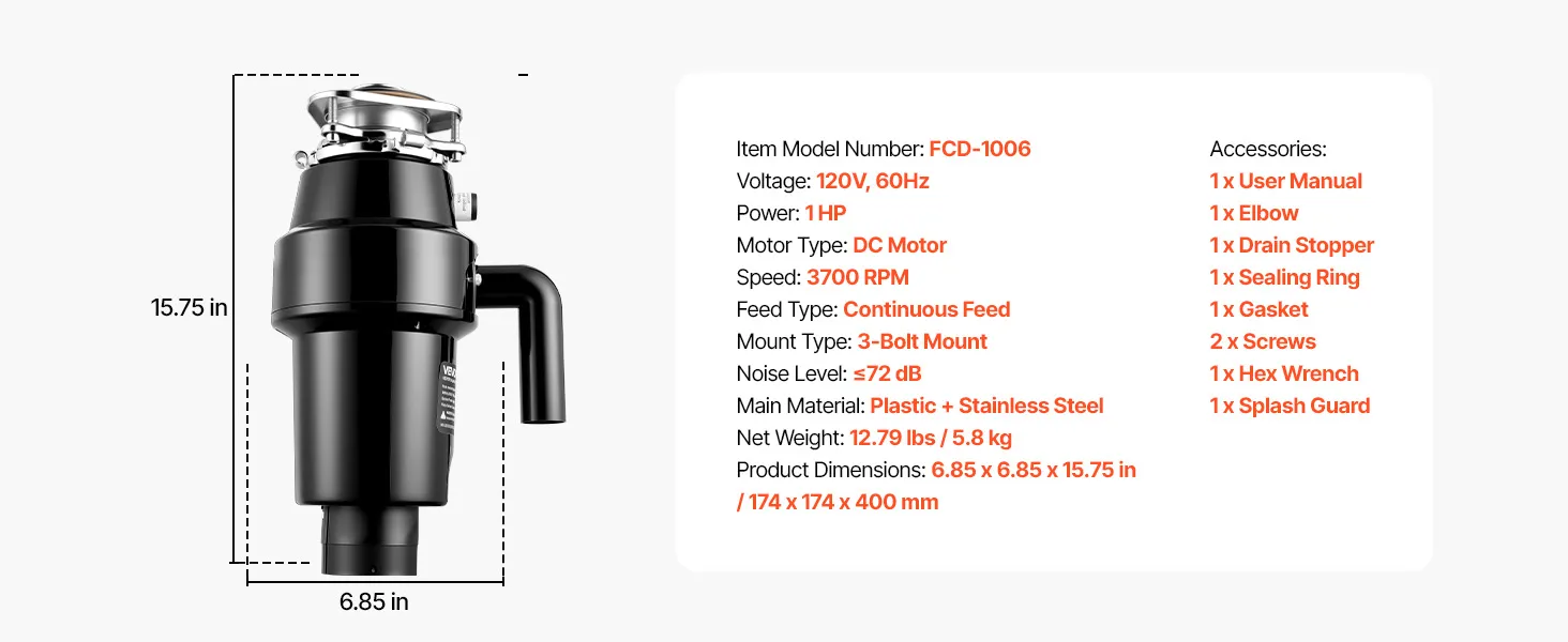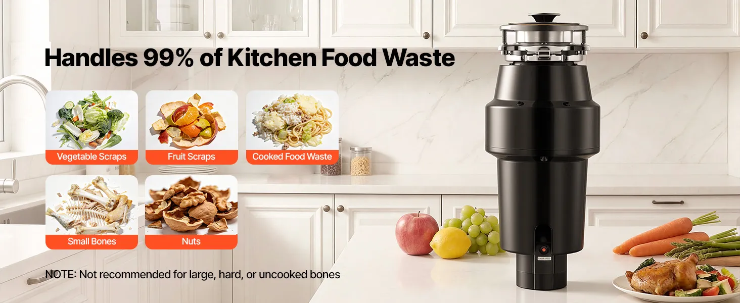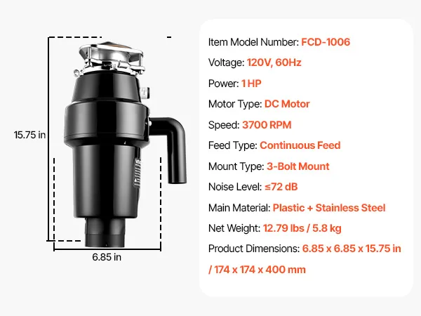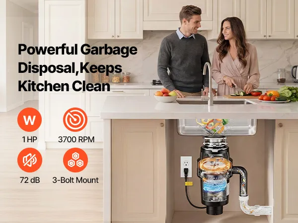 Trituración potente, eliminación más rápida: Impulsado por un motor de CC de imán permanente de 1 HP a 3700 RPM, este triturador de residuos de alimentos VEVOR ofrece un potente rendimiento de trituración. Descompone rápidamente los restos de comida, reduce las obstrucciones de los desagües y mantiene la cocina limpia.