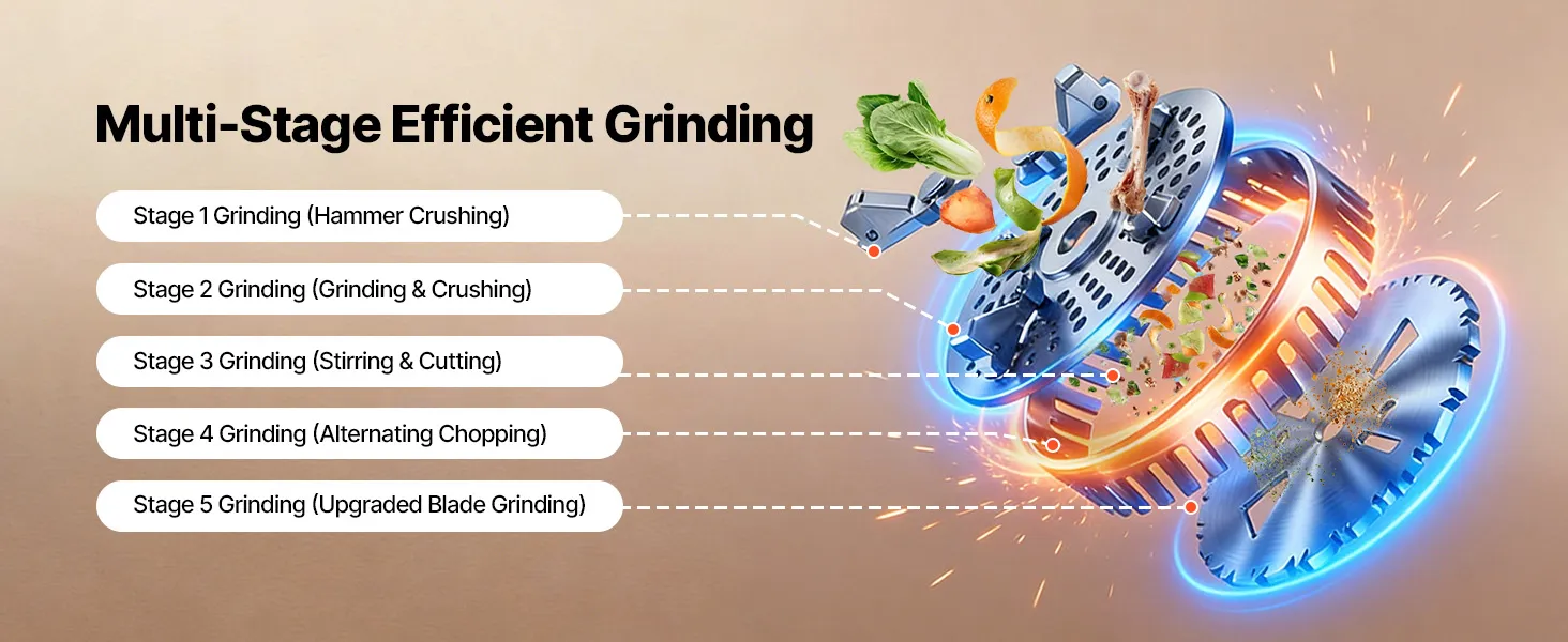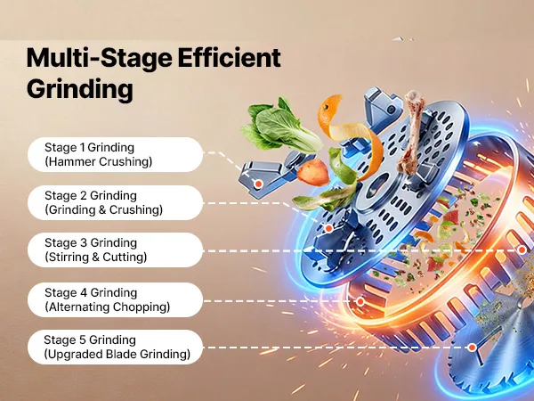 El sistema de molienda de múltiples etapas descompone eficientemente los desechos de alimentos en partículas más finas, lo que ayuda a reducir las obstrucciones y al mismo tiempo brinda un rendimiento suave y un funcionamiento diario confiable.