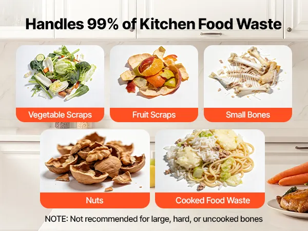 Procesa eficazmente restos de verduras, cáscaras de fruta, restos de comida cocinada, huesos pequeños y frutos secos. Reduce la acumulación de residuos y el riesgo de obstrucciones. (No se recomienda para huesos grandes, duros o crudos).