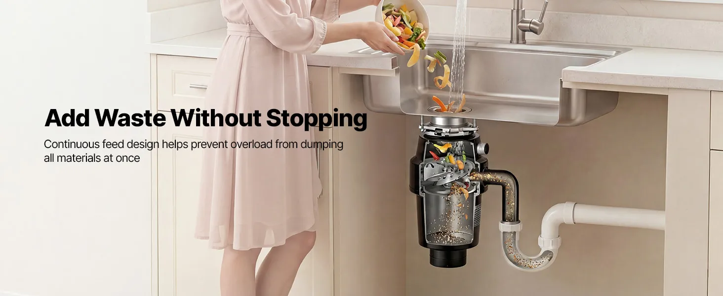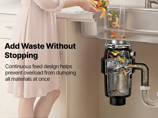 Alimentación continua: Este triturador de residuos de comida ofrece alimentación continua con trituración multietapa para procesar una amplia gama de restos de cocina. Tritura eficazmente cáscaras de verduras, espinas de pescado, huesos de fruta y más, minimizando las obstrucciones del fregadero.
