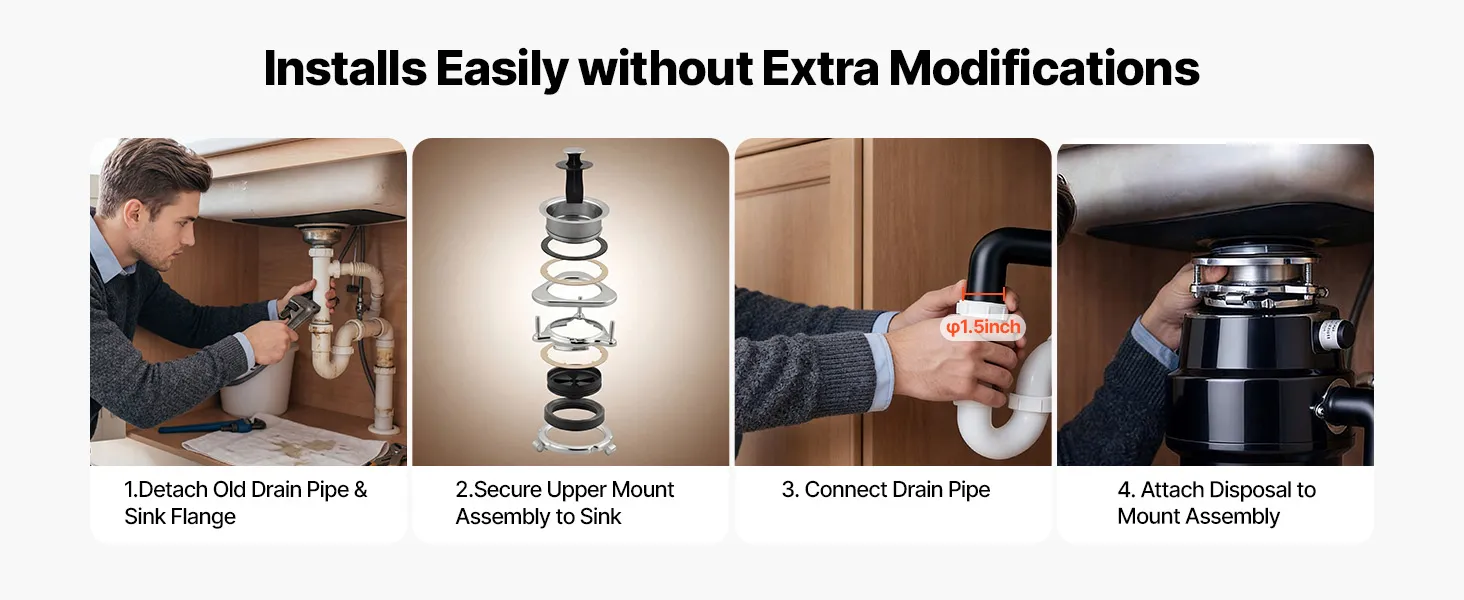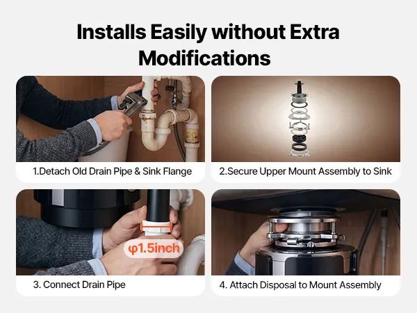 Diseñado con un sistema de montaje de 3 pernos, este triturador de basura se instala rápidamente. Ponga en funcionamiento su triturador de basura en minutos y comience a procesar los residuos de cocina eficientemente.