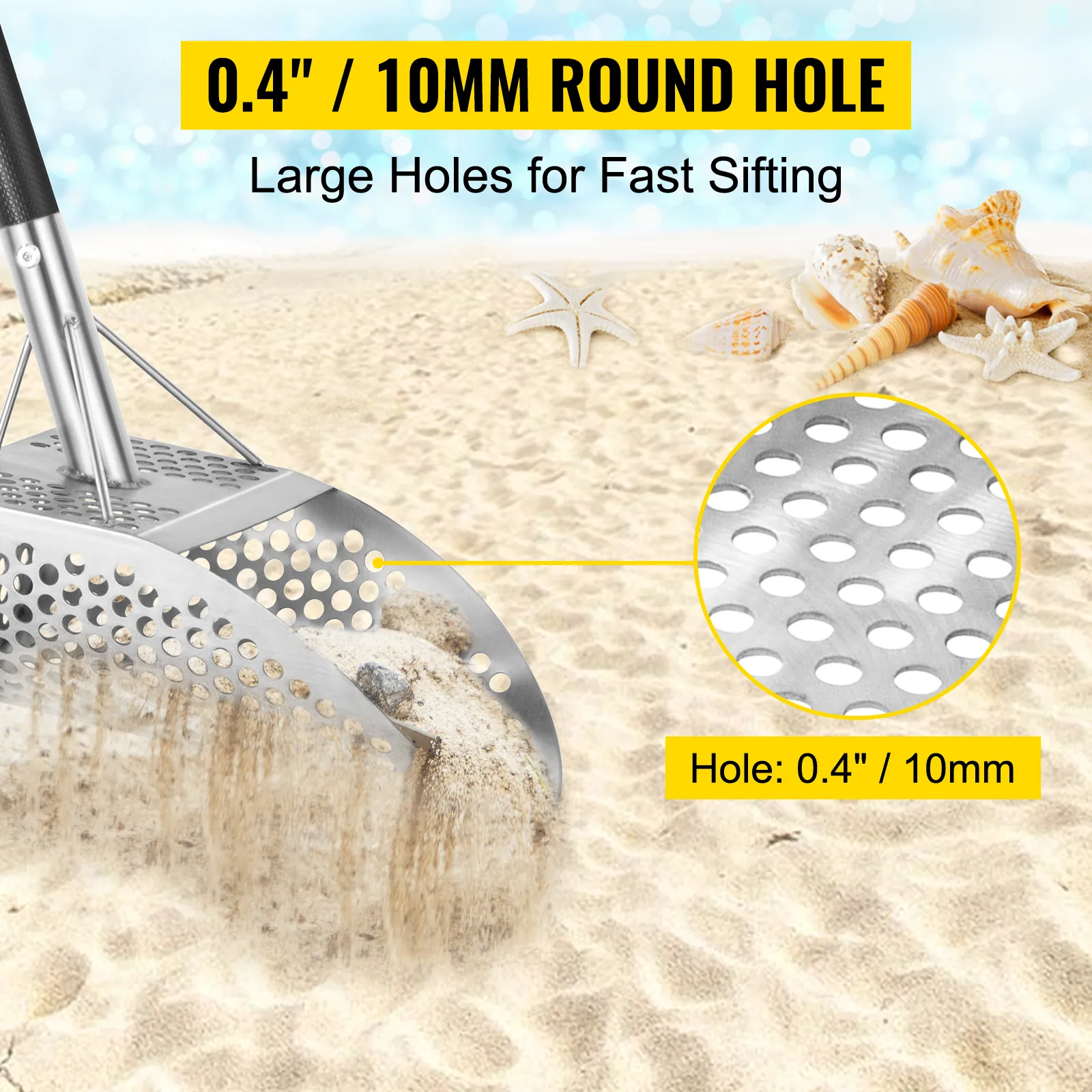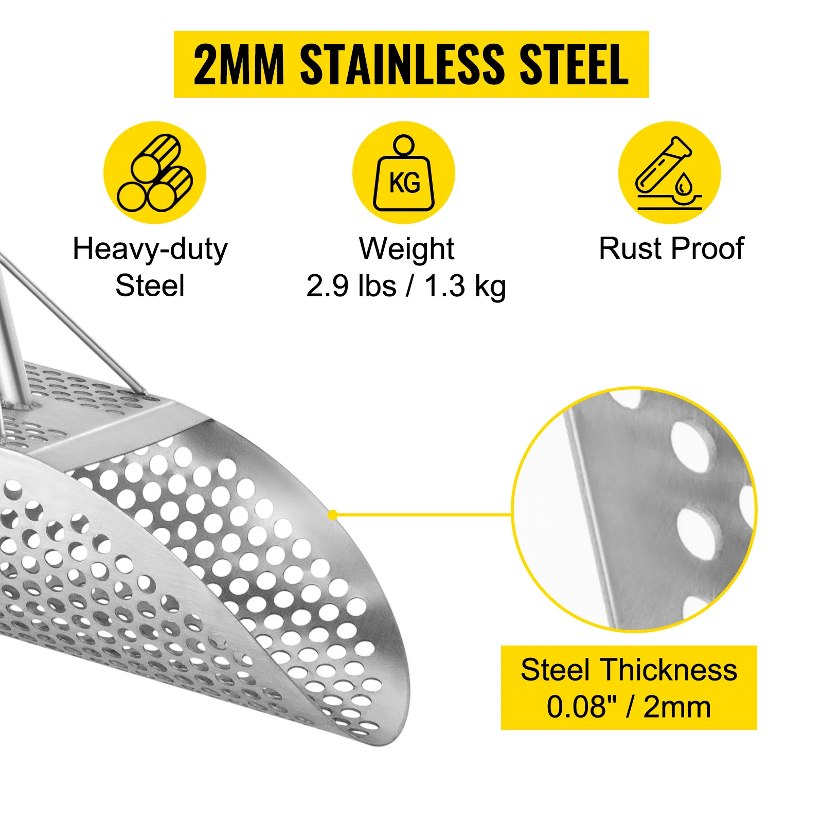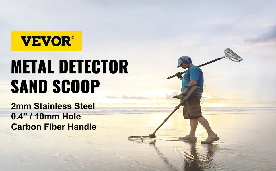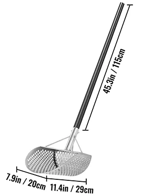Hecho de acero inoxidable de 2 mm de espesor de excelente calidad, es lo suficientemente resistente y duradero para una vida útil prolongada. Los orificios redondos de 10 mm están diseñados para un tamizado rápido y una búsqueda rápida. El bastón de mango largo le ofrece un agarre cómodo y fácil. Al ser resistente y ligero, es fácil de transportar. Además, puede funcionar con un detector de metales para la búsqueda de tesoros.